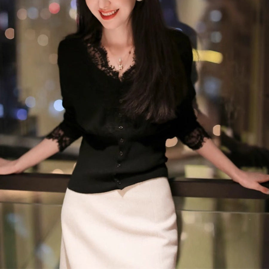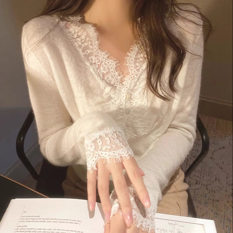 Bluza dama din tricot, cu decolteu in V cu terminatii din dantela, prezinta maneci lungi.