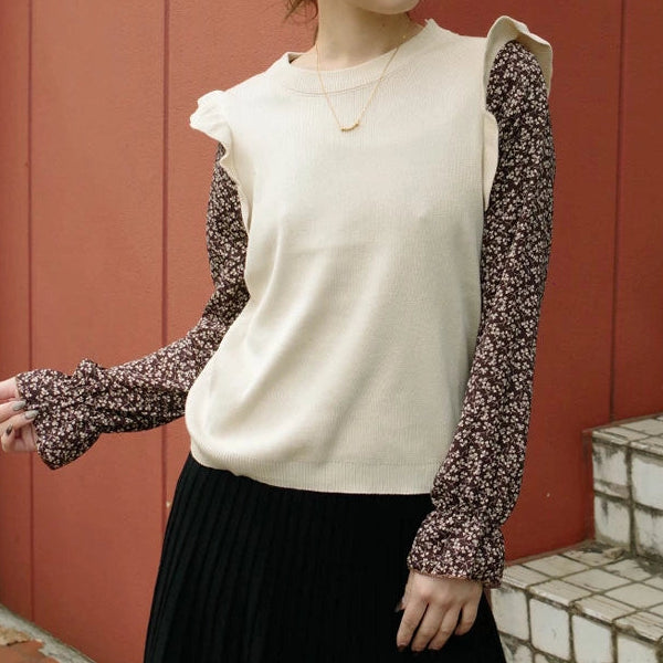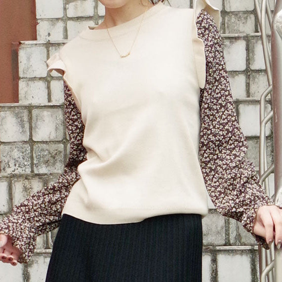 Bluza dama din tricot , cu decolteu rotund. Prezinta maneci din voal cu imprimeu floral.
