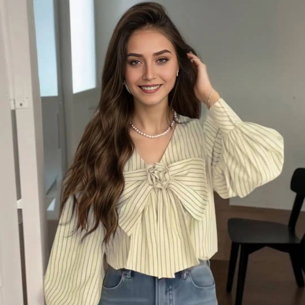 Bluza Darla, este alegerea ideala pentru o zi cocheta la birou, dar si pentru alte tinute de zi. Camasa este accesorizata cu o funda din acelasi material in zona pieptului.