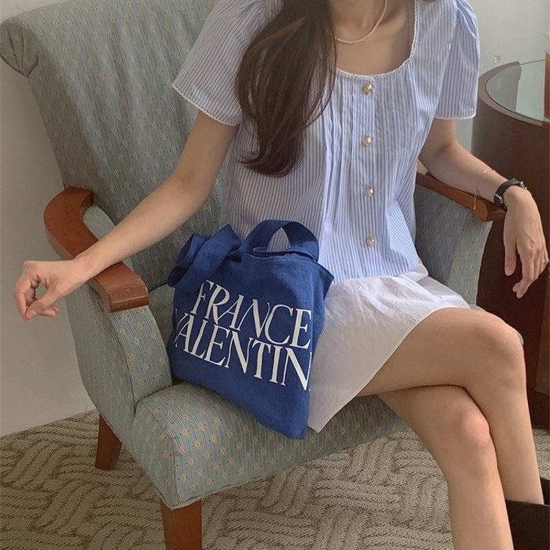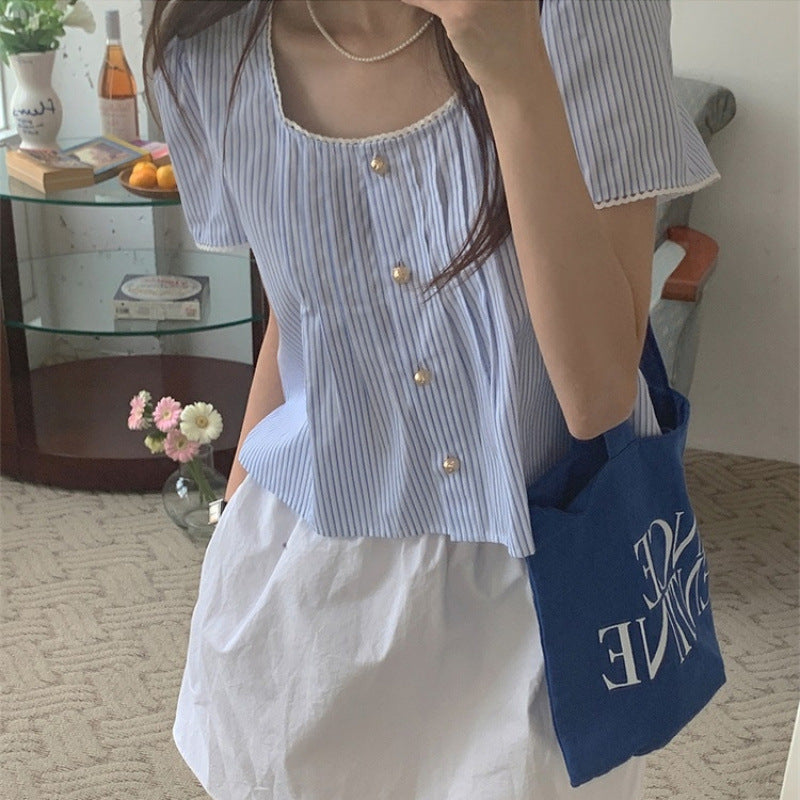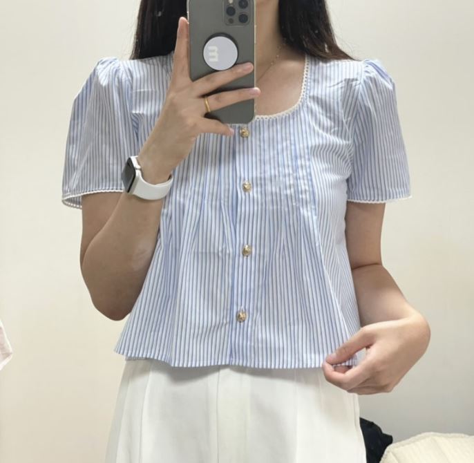 Camasa dama in dungi cu maneci scurte cu terminatii din dantela, croi lejer, decolteu rotund si nasturi aurii.