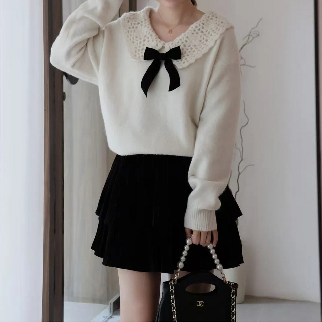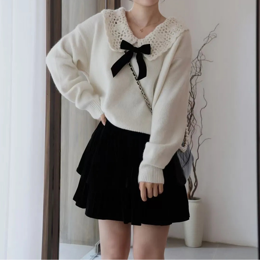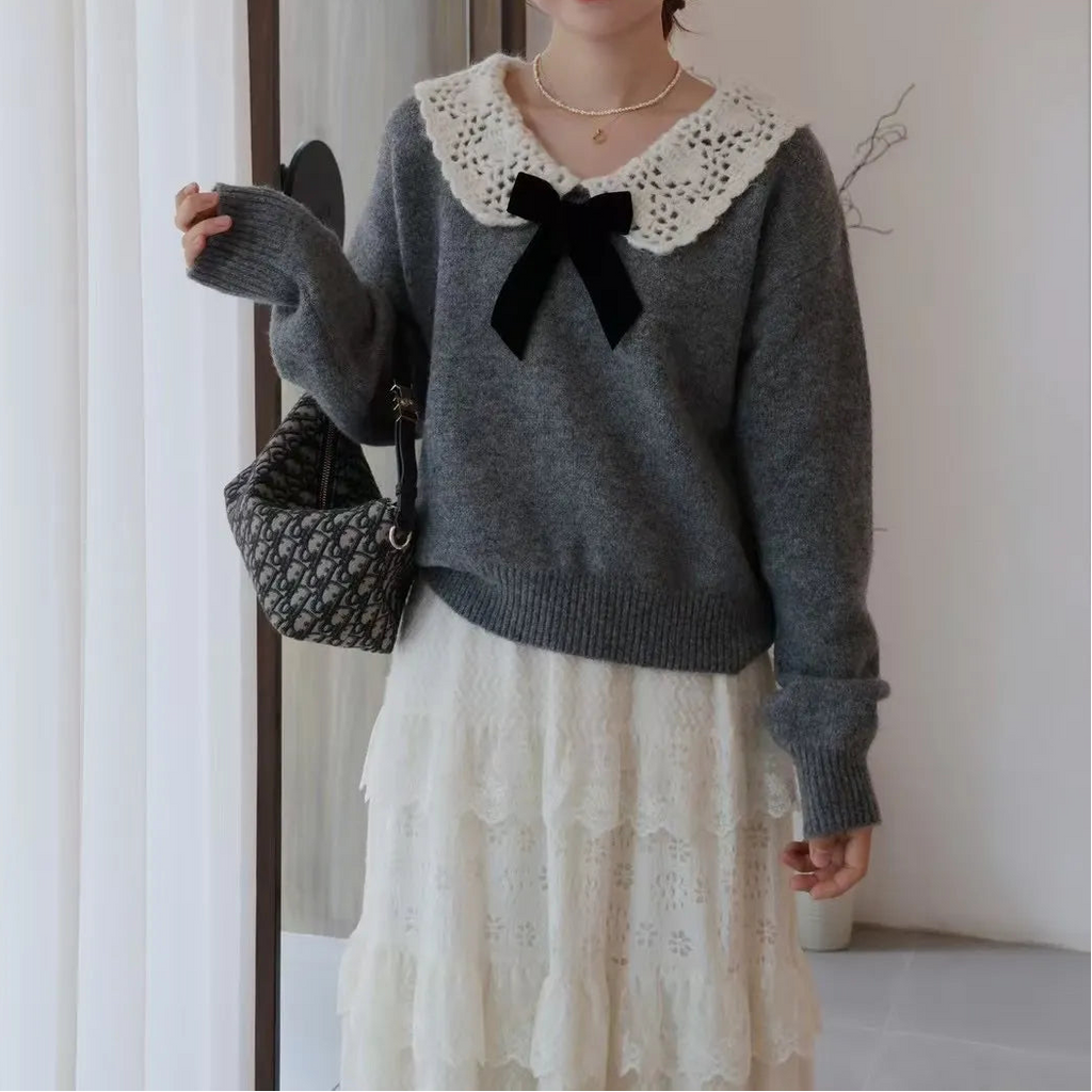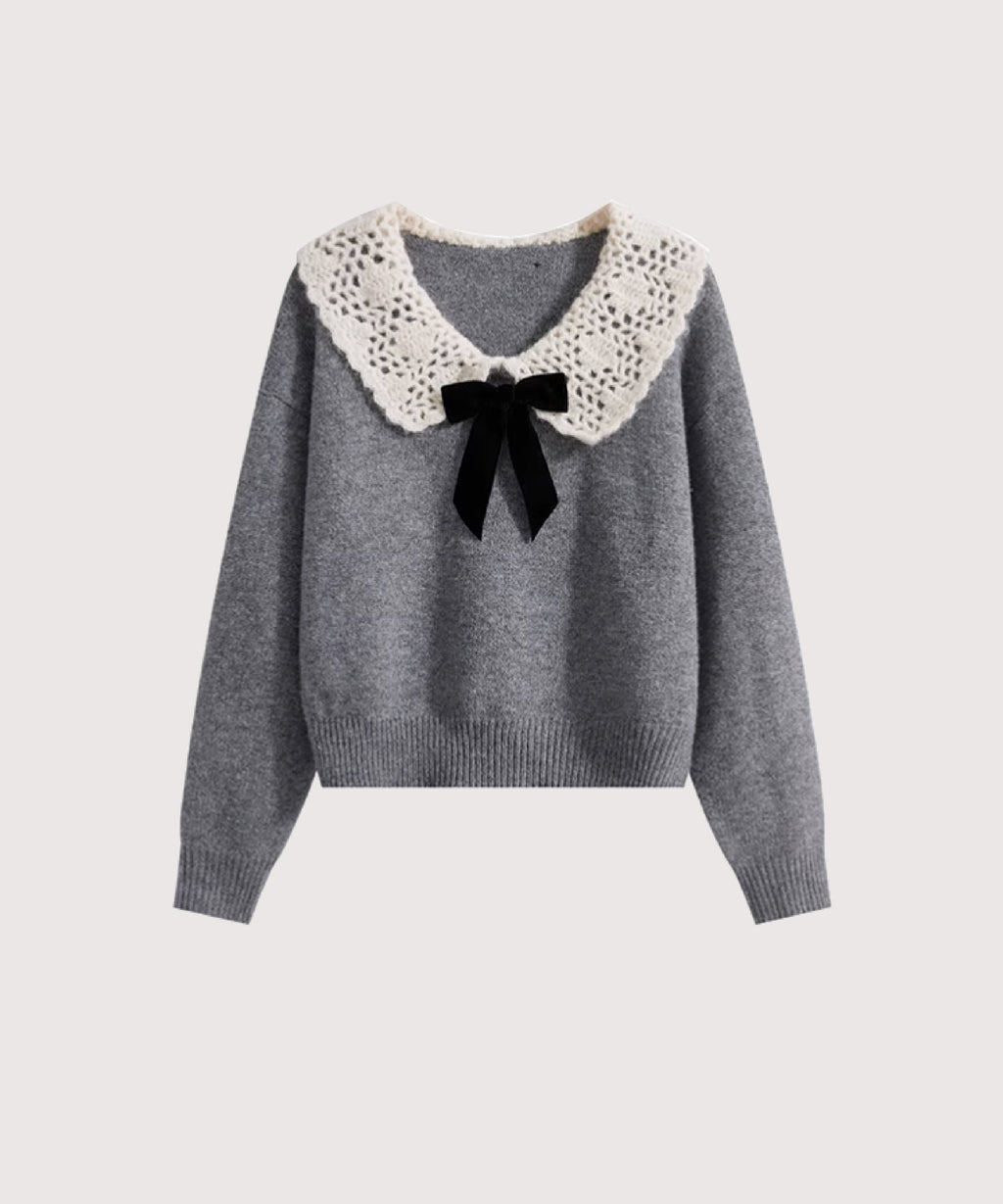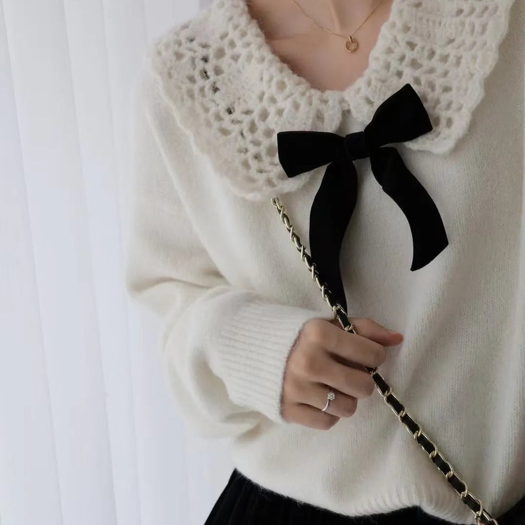 Bluza dama din tricot, cu guler lat si fundita.
