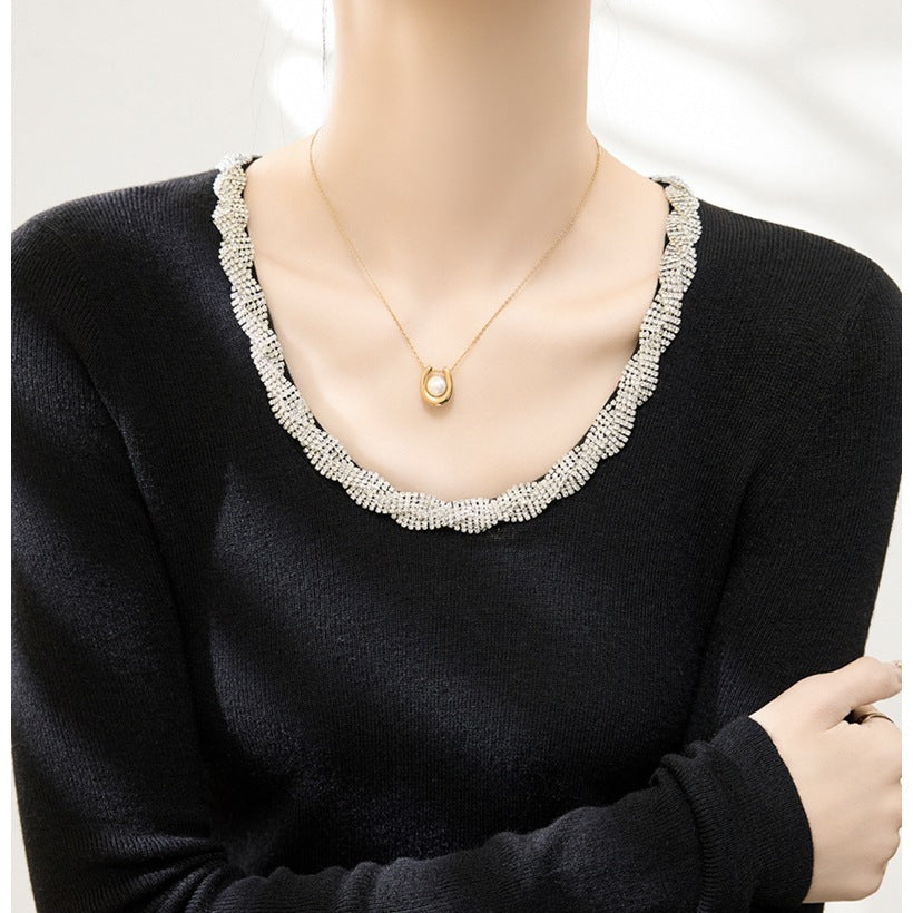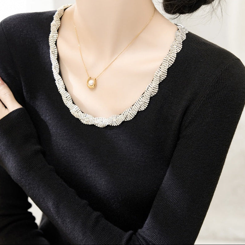 Bluza dama stil office-elegant, confectionata din tricot moale, usor elastic. Are maneci lungi, decolteu rotund, croi drept. Se remarca prin decolteul accesorizat cu pietre strass ce confera o nota eleganta tinutei.