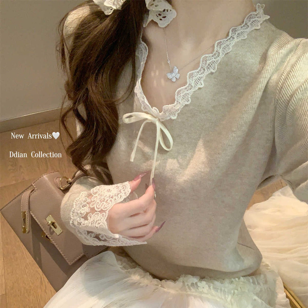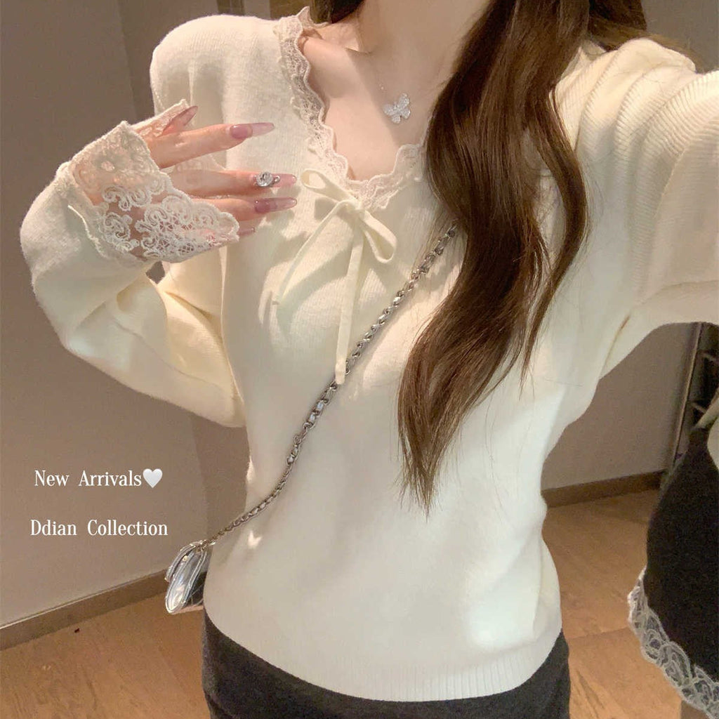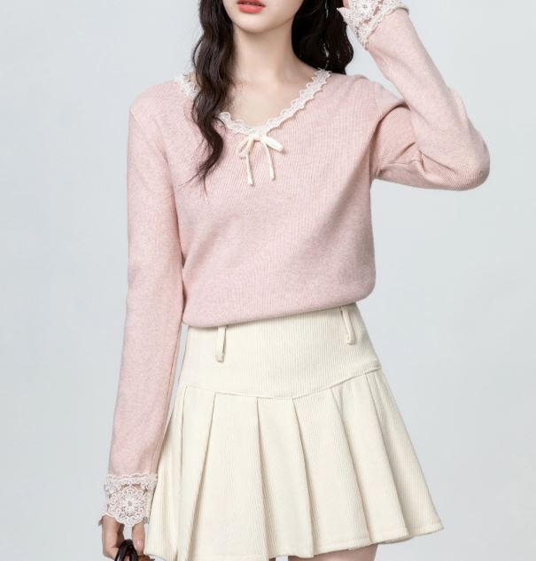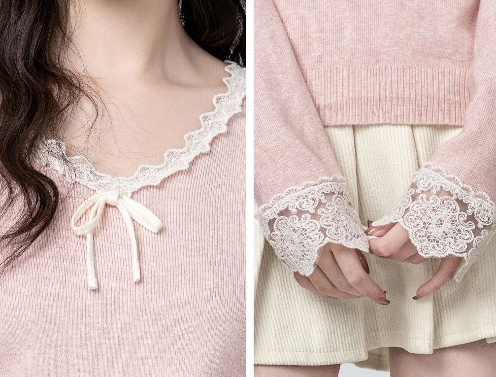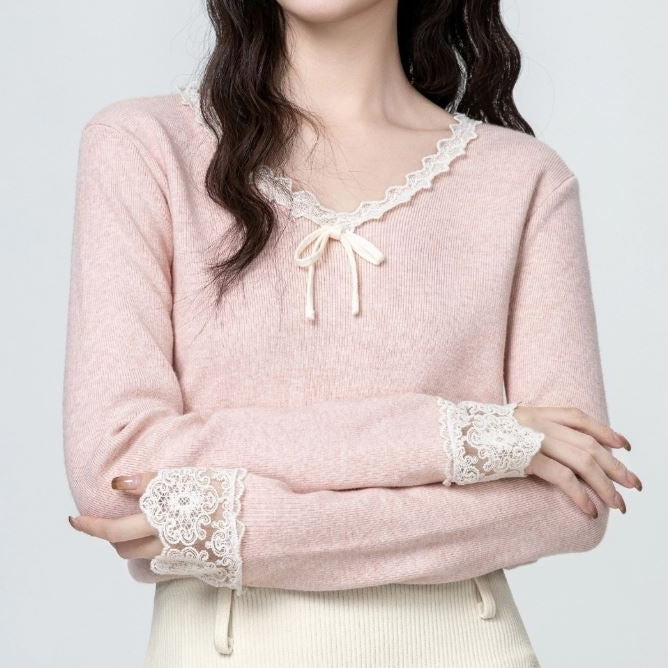 Bluza dama din tricot, cu decolteu in V cu terminatii din dantela, prezinta maneci lungi.