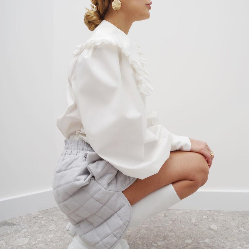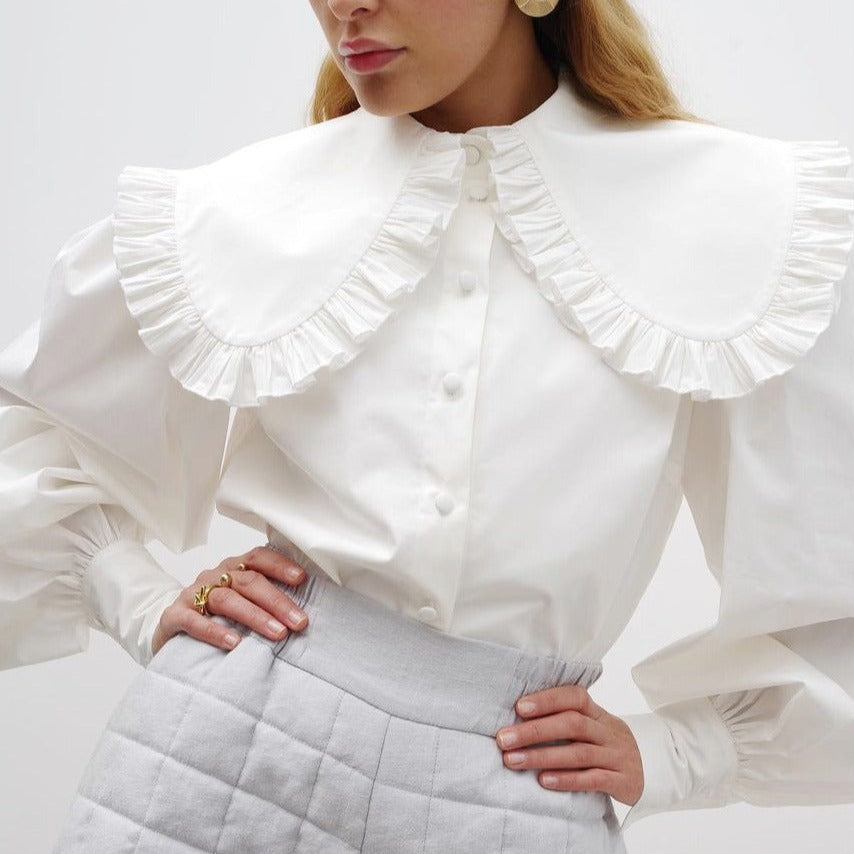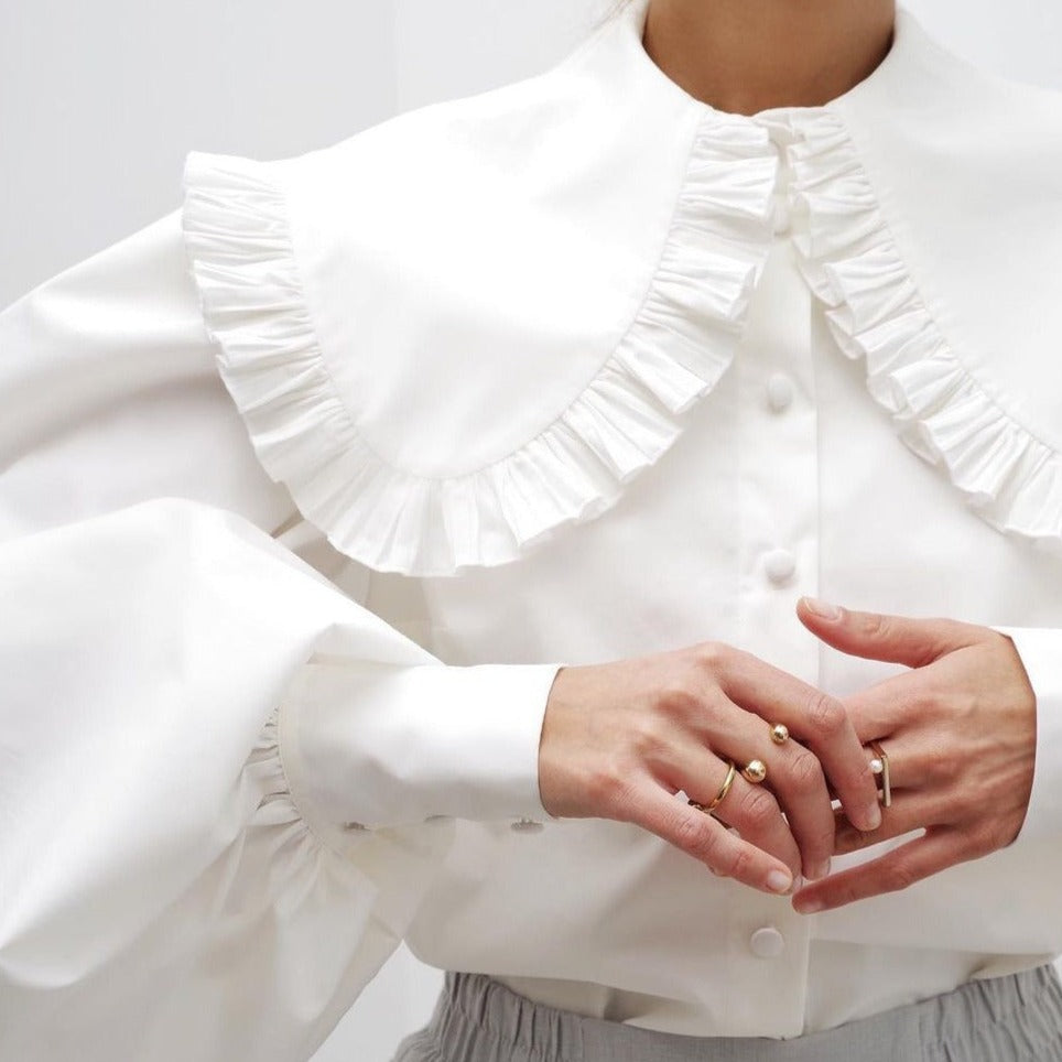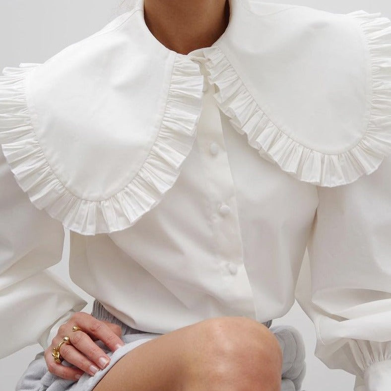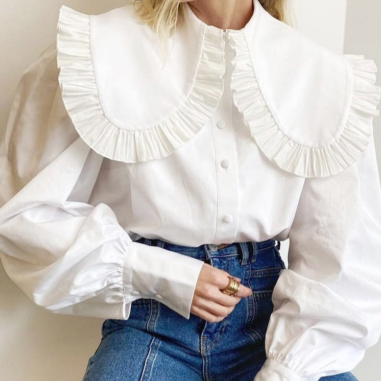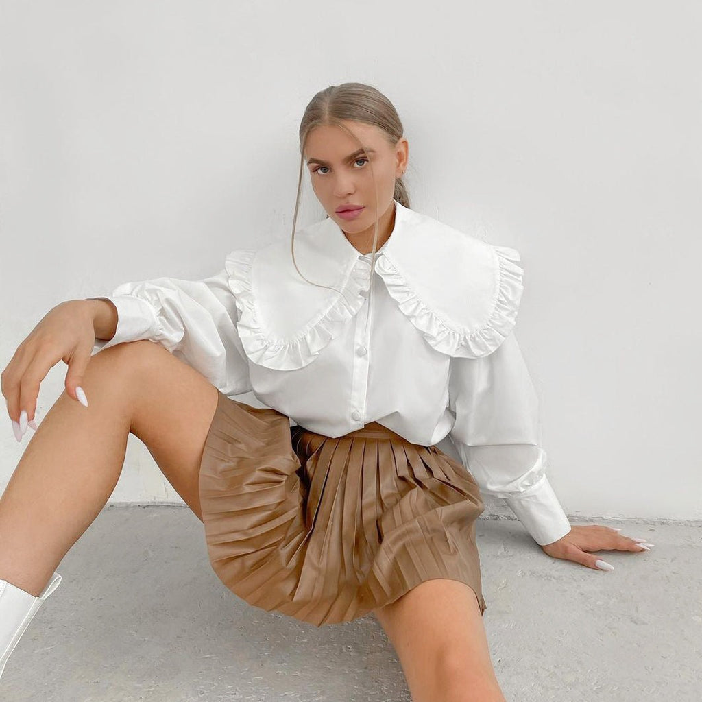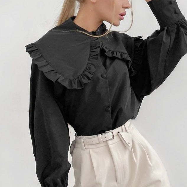 Camasa cu guler lat,confectionata dintr-un material placut la atingere. Are maneca lunga cu manseta lata cu elastic. Se inchide cu nasturi.