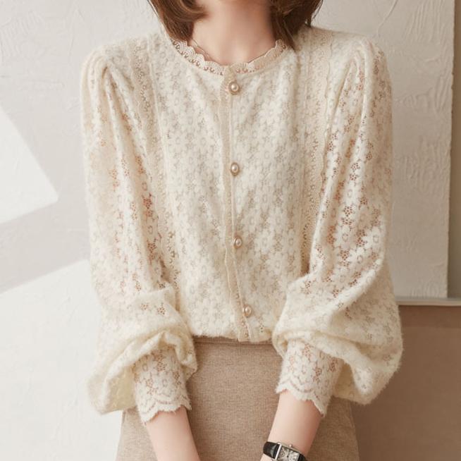 Camasa retro confectionata din dantela cu nasturi si cu decolteu in V. Are maneci lungi si mansete din dantela lata. Se inchide cu nasturi opali in fata.