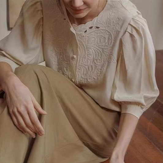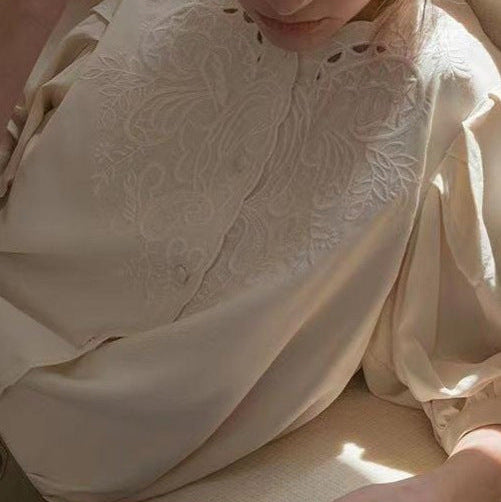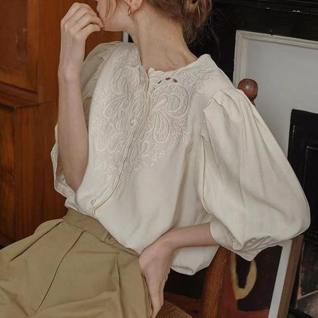 Camasa dama cu croială largă, din țesătură vaporoasă de viscoză, cu broderie florala în față. Prezinte mâneci lungi bufante și cu manșete.