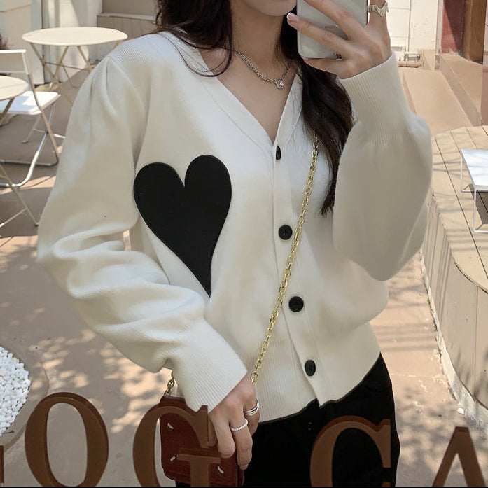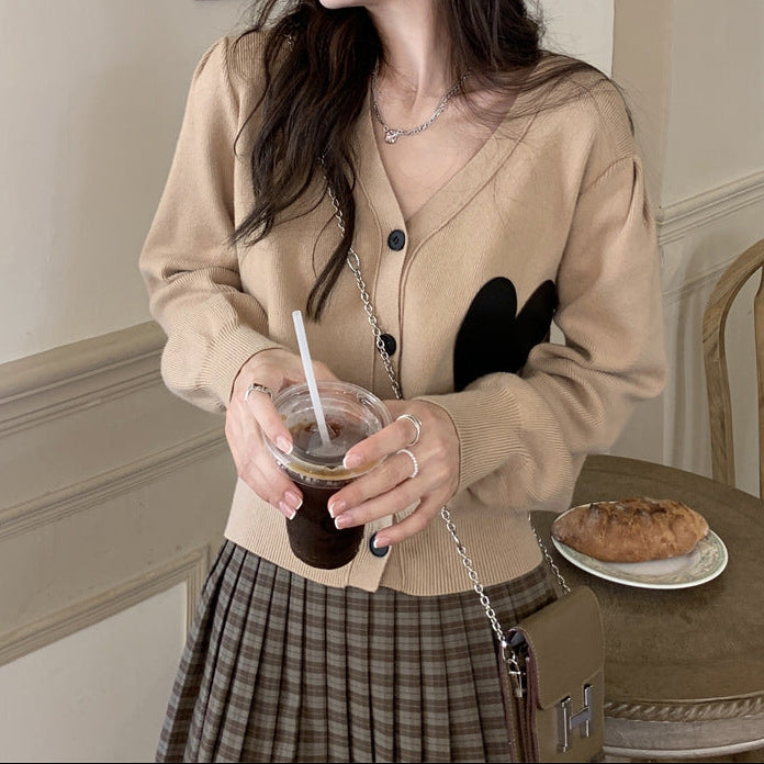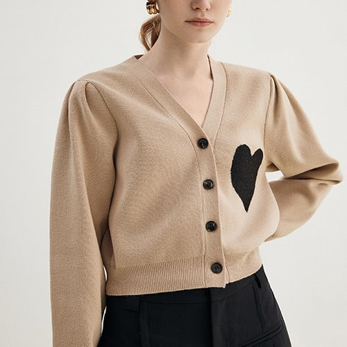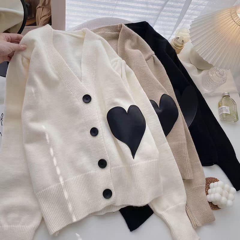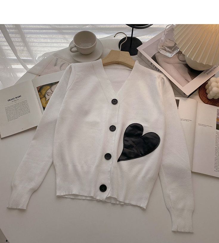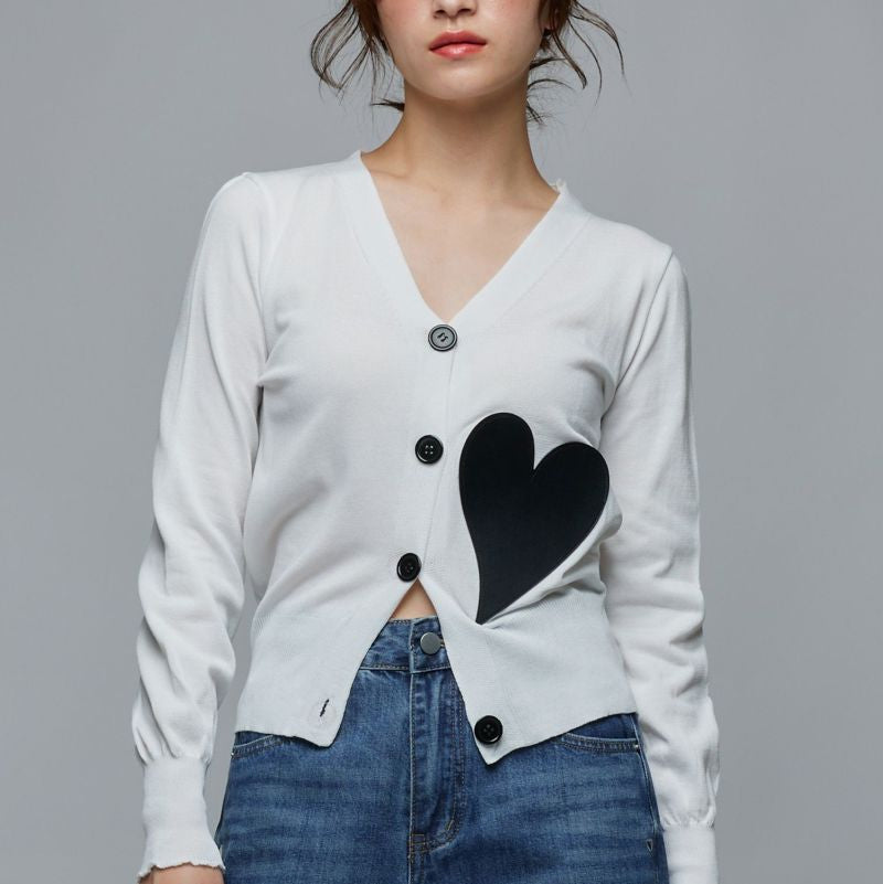 Cardigan confectionat din tricot fin cu imprimeu tip inimioare, maneci lungi cu mansete reiate. Prezinta decolteu in forma de V si inchidere prin nasturi in fata.