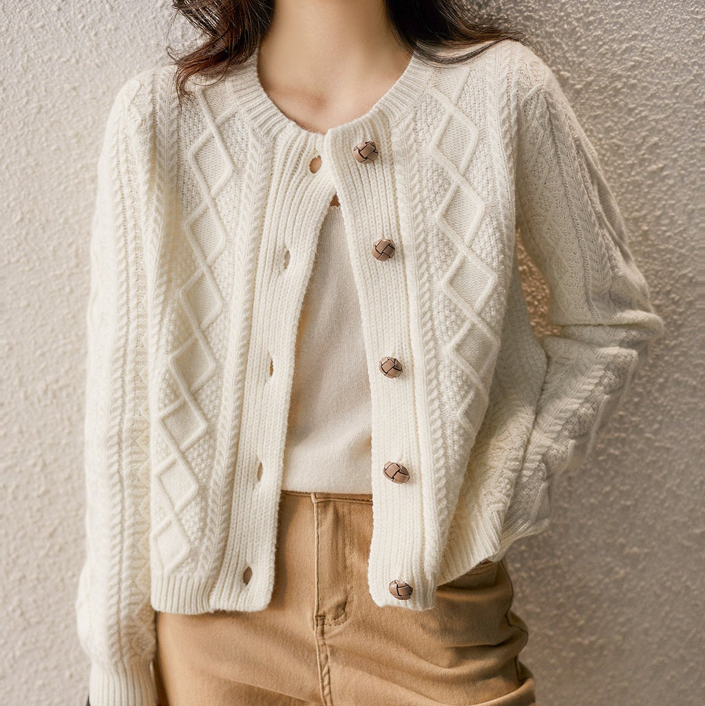 Cardigan confectionat din tricot impletit gros, perfect pentru sezonul racoros. Prezinta guler rotund, maneci lungi cu mansete reiate, late. Inchiderea se face prin cei 5 nasturi maro din fata.
