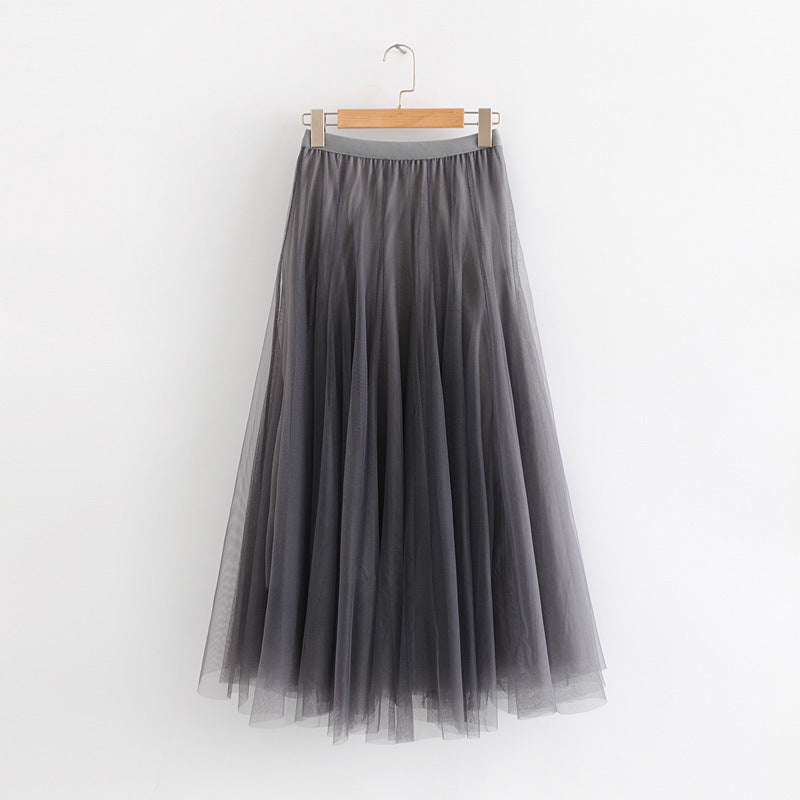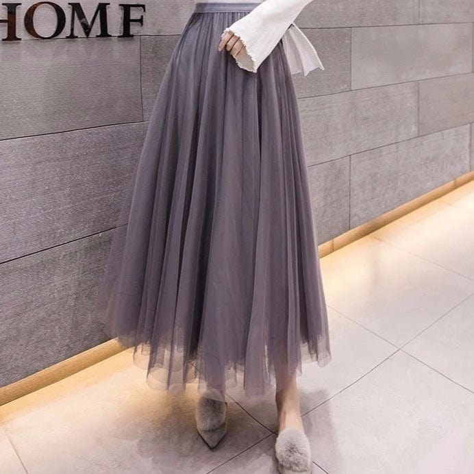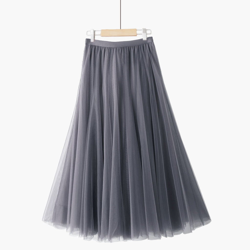 Fusta midi, plisata, confectionata din tulle moale. Are captuseala matasoasa si talie elastica.