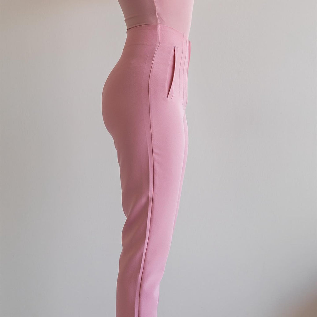 Pantaloni dama cu talie inalta si croiala conica, are buzunare laterale false si pense pentru accentuarea taliei. Se inchide in fata cu fermoar si nasture metalic.