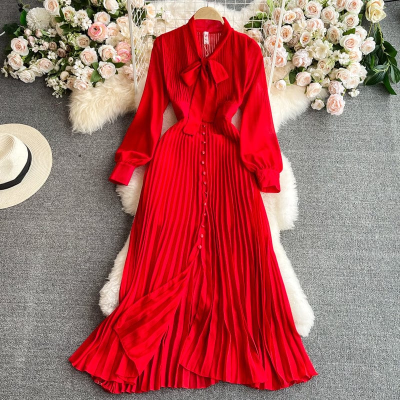 Rochie midi plisata confectionata din voal . Are maneci lungi cu manseta lata care se inchide cu nasture si guler rusesc cu incretituri. Este accesorizata cu panglica care se leaga fundita. Partea de jos este plisata si accesorizata cu nasturi imbracati. Rochia are captuseala.