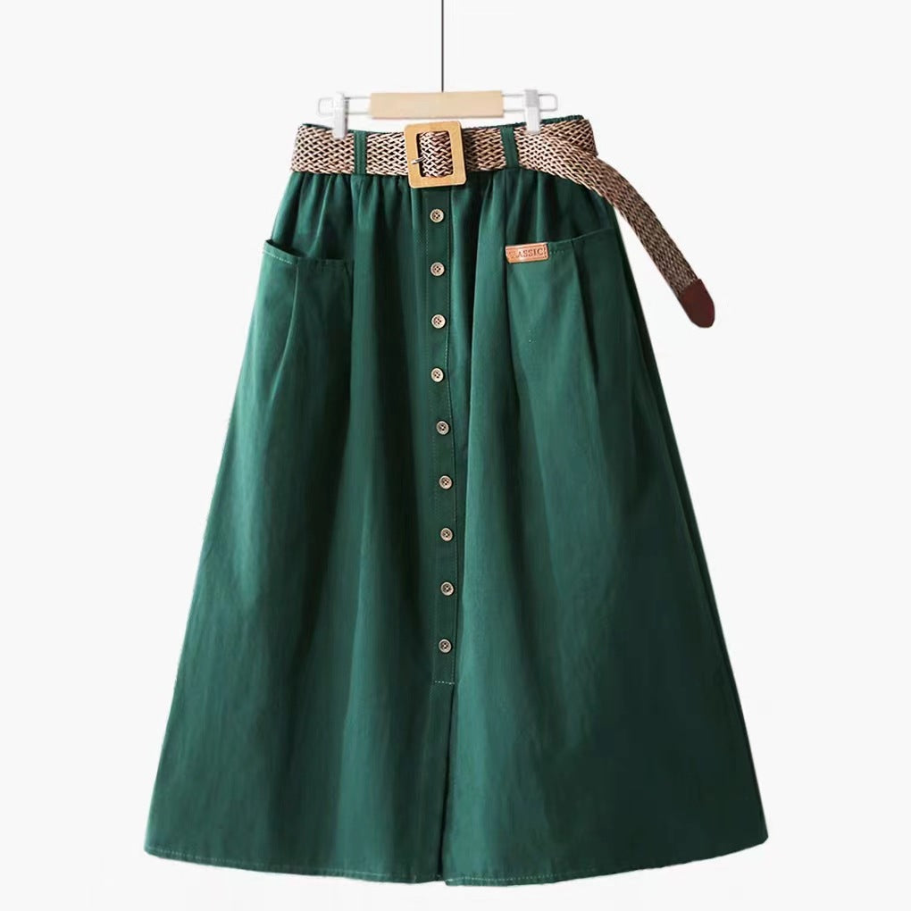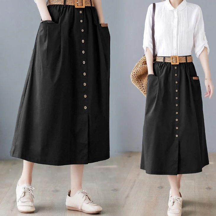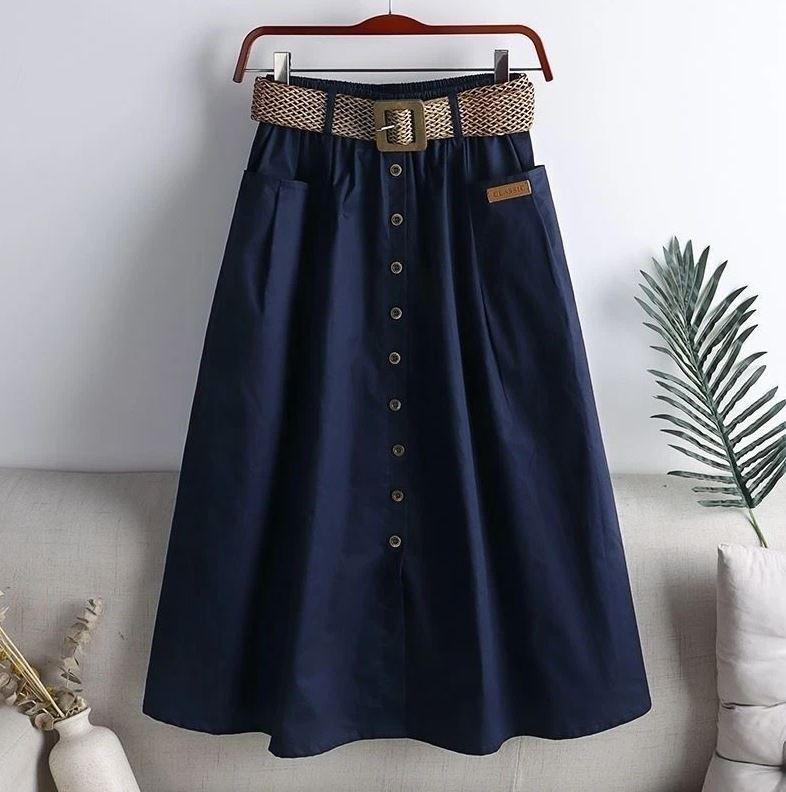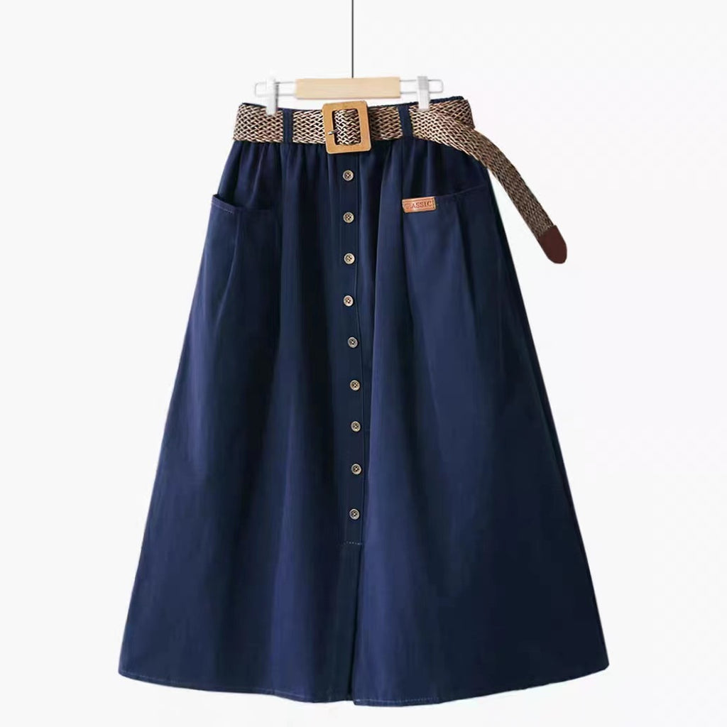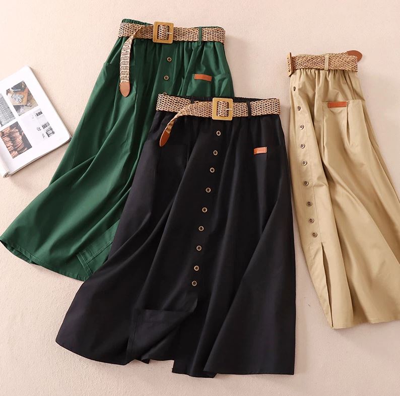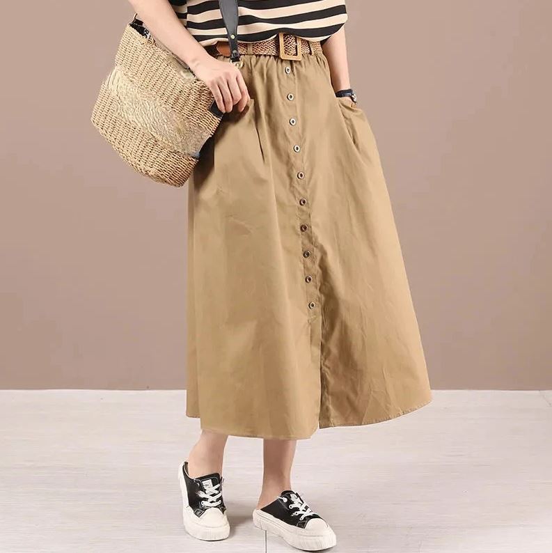 Fusta midi stil casual-eleganta, cu talie inalta decorata cu nasturi maro in partea din fata. Are croi A-line si elastic in talie, ceea ce o face lejera la purtare. Catarama din lemn la curea.