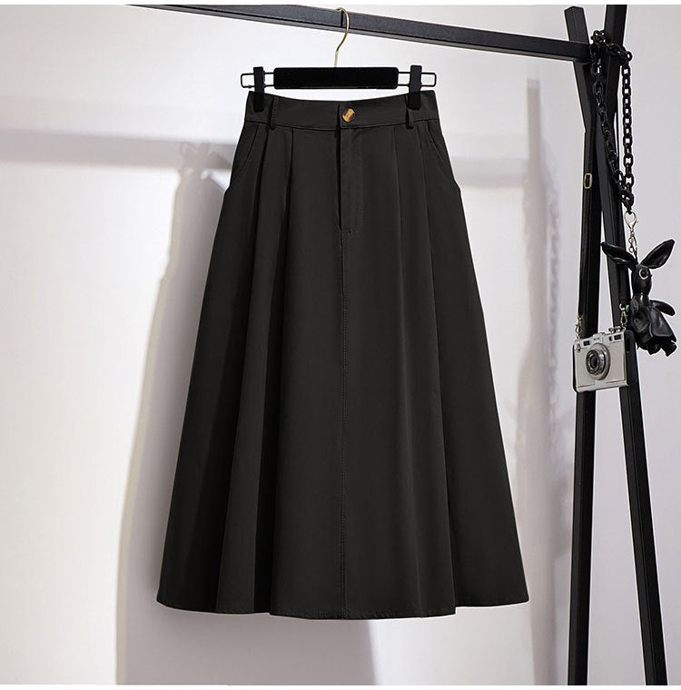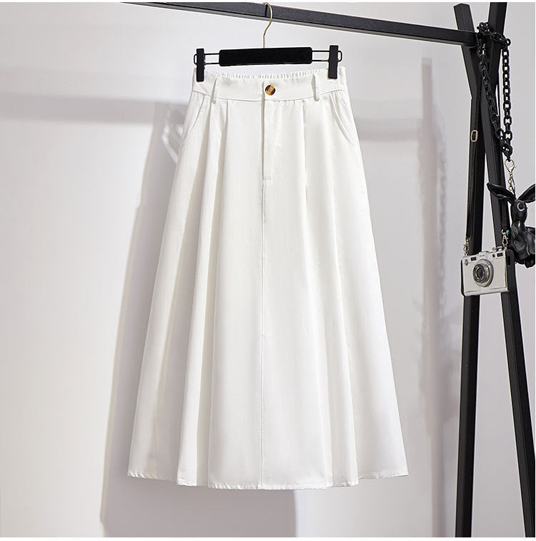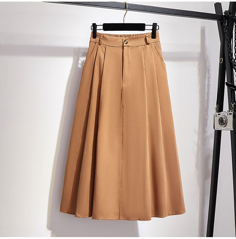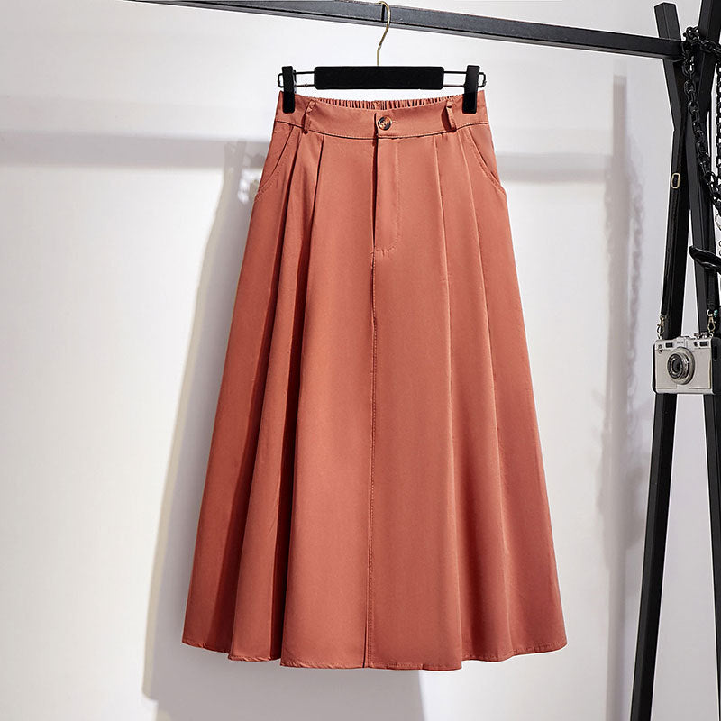 Fusta midi din material lejer cu talie elastica la spate si inchidere prin fermoar si nasture. Croiul e lejer in A.