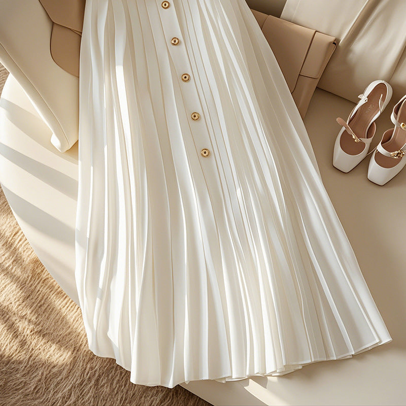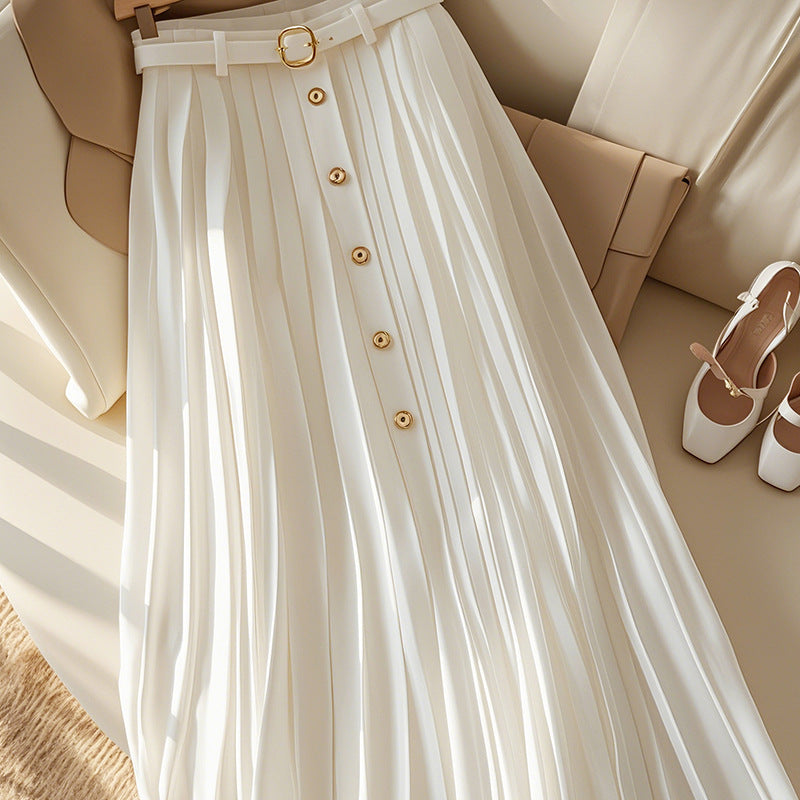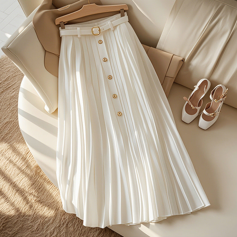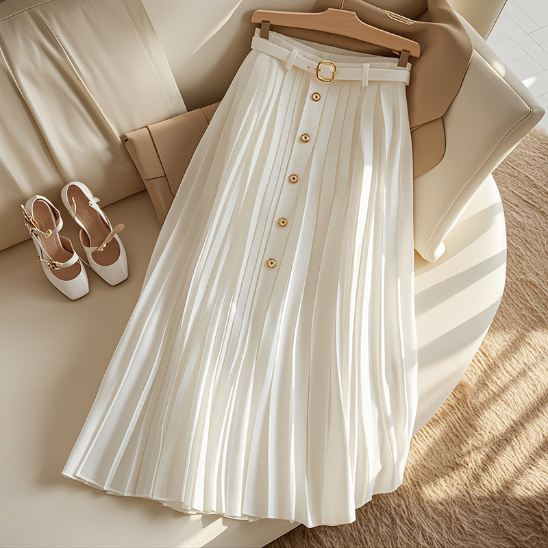 Fusta petrecuta tip A-line, cu croi lejer si pliuri. Prezinta talie accesorizata prin curea.