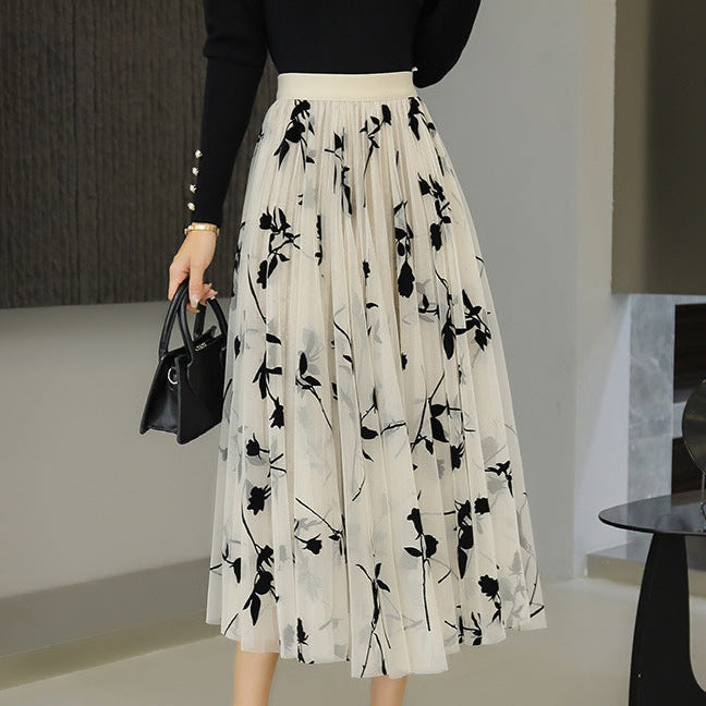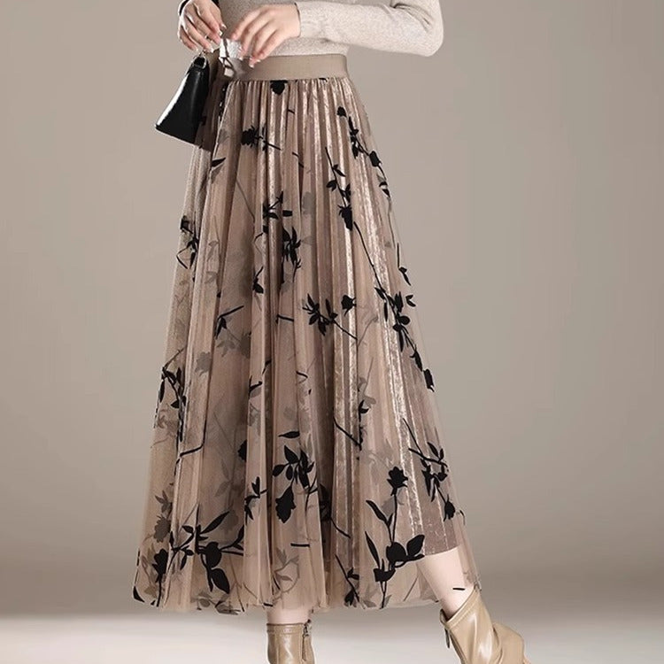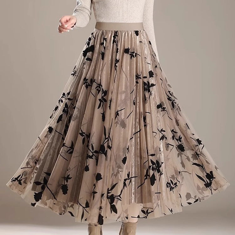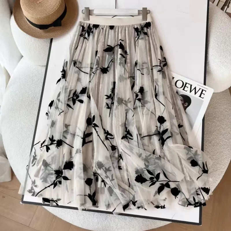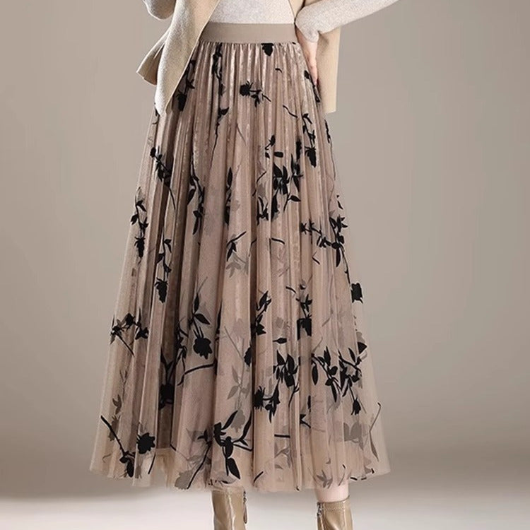 Fusta midi eleganta din tulle cu insertii, are aplicate detalii florale, elastic in talie pentru lejeritate la purtare, are captuseala.