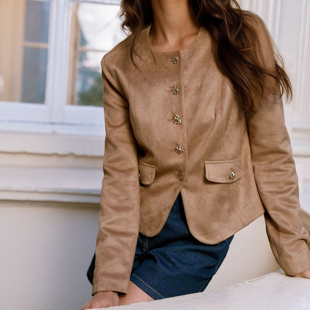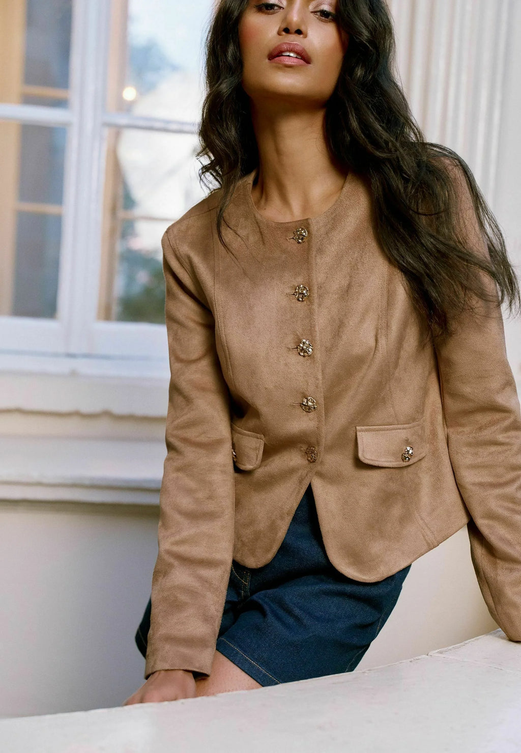 Jacheta cu maneci lungi si inchidere cu nasturi. Jacheta este calduroasa si eleganta. Prezinta buzunare laterale in fata.