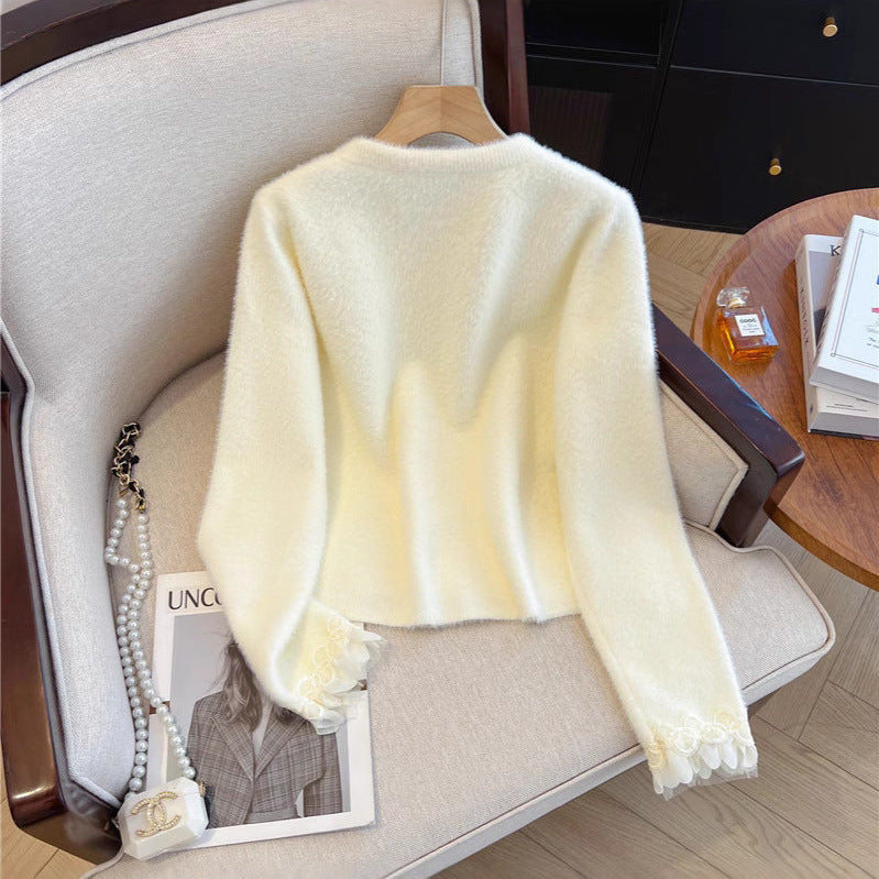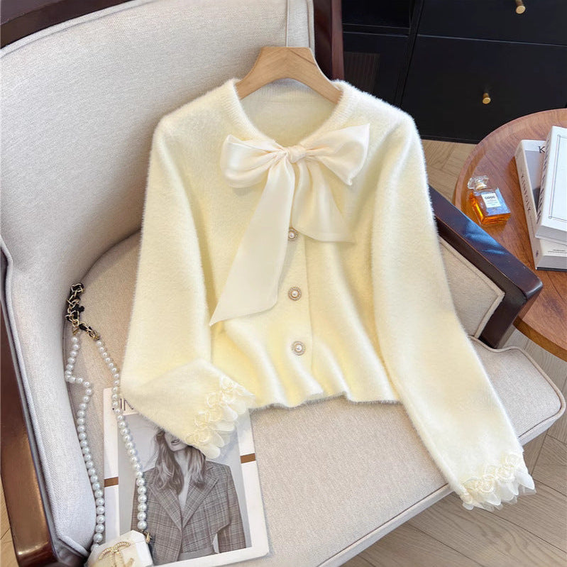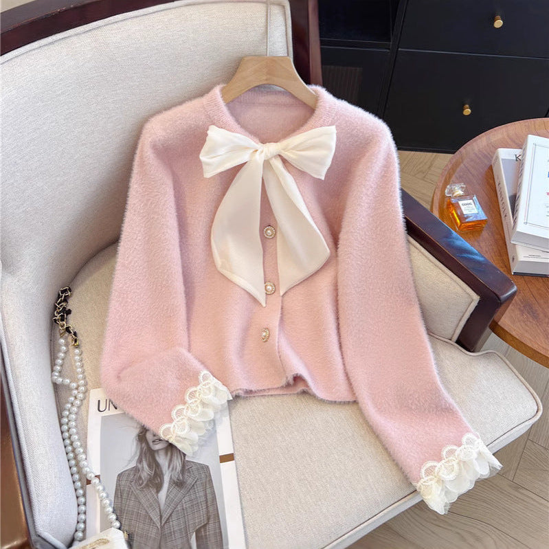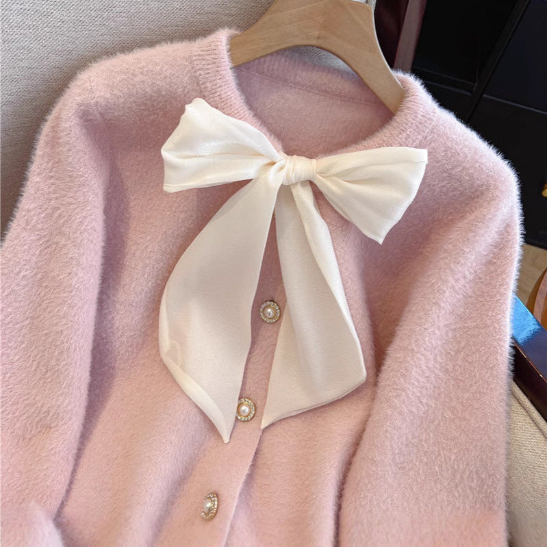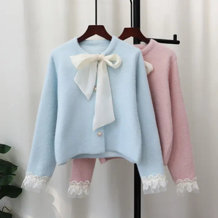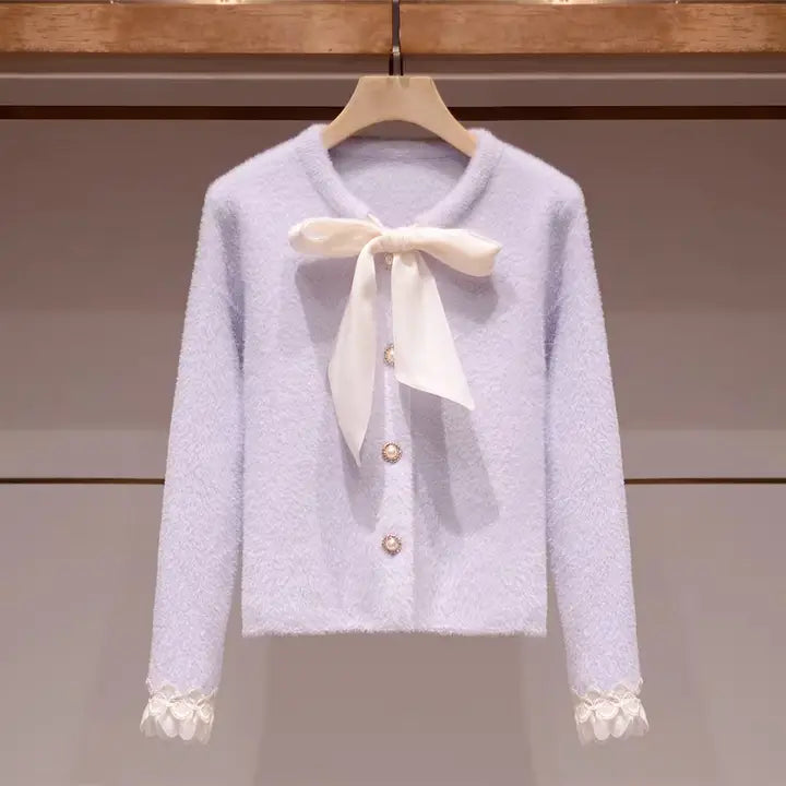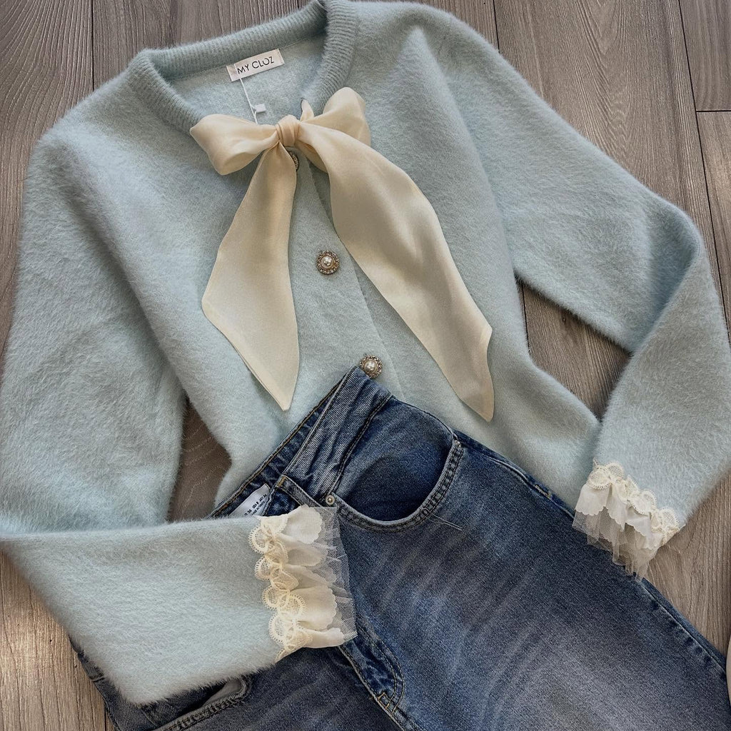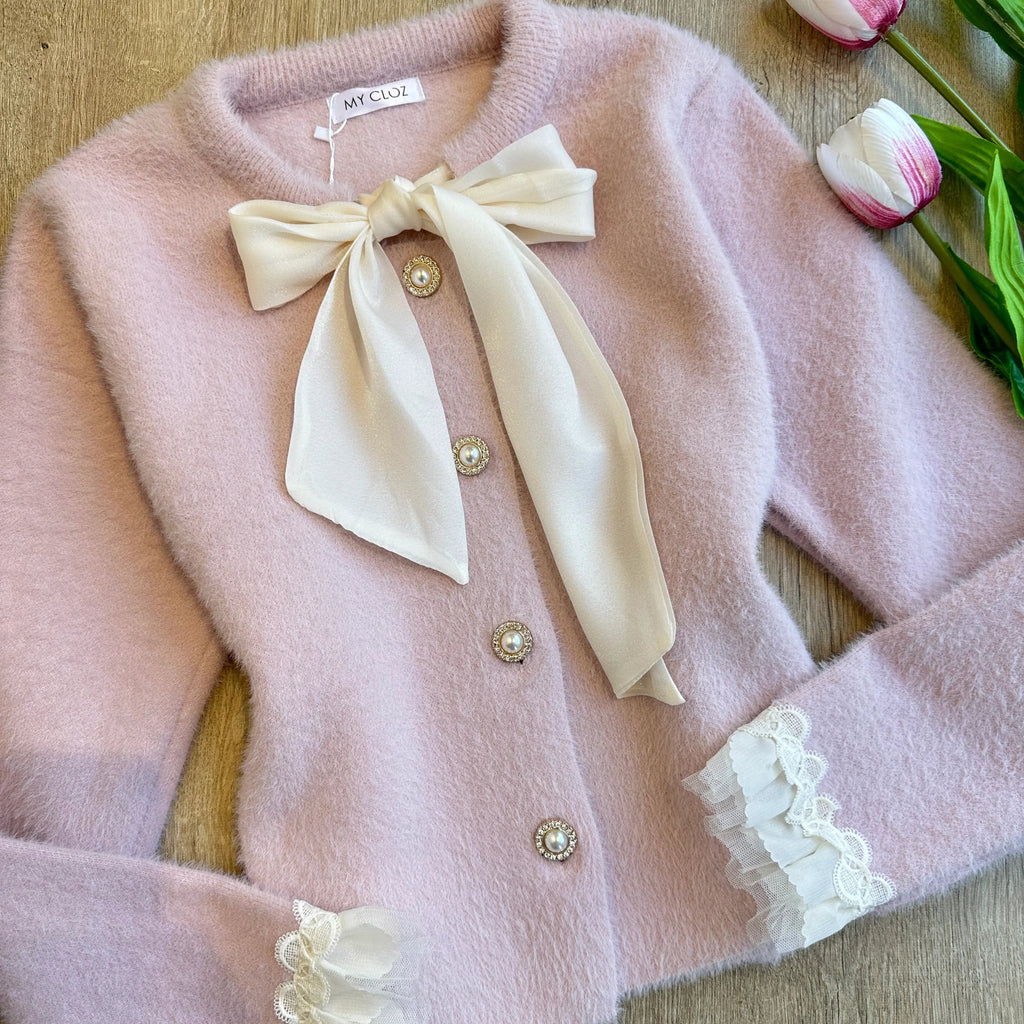 Jerseu confectionat din tricot moale, cu croi lejer, accesorizat cu esarfa. Se inchide cu nasturi si are un guler cu efarfa. Are mansete din dantela.