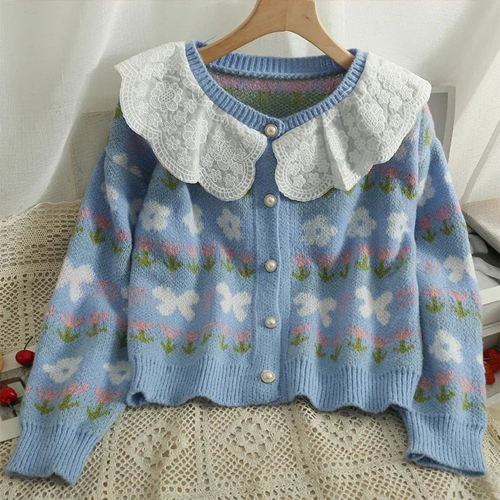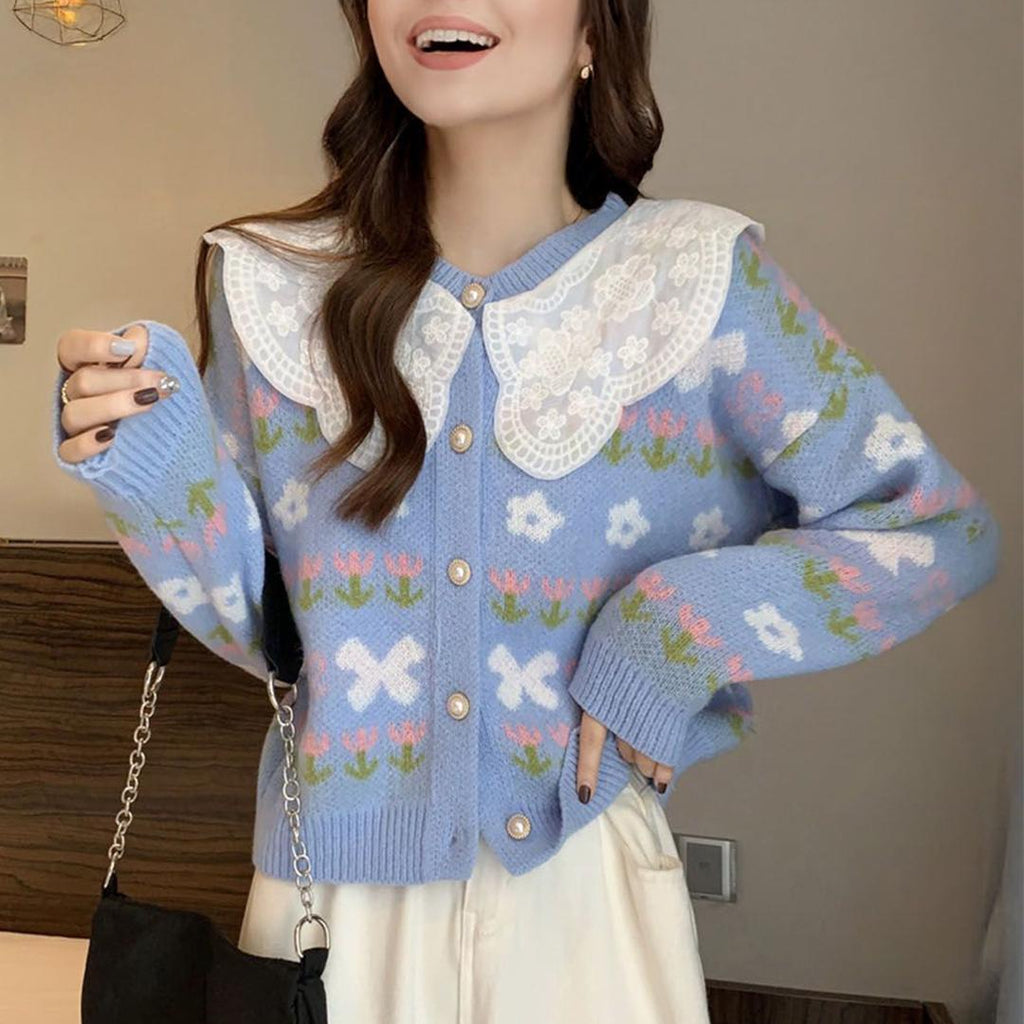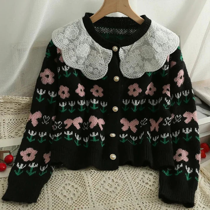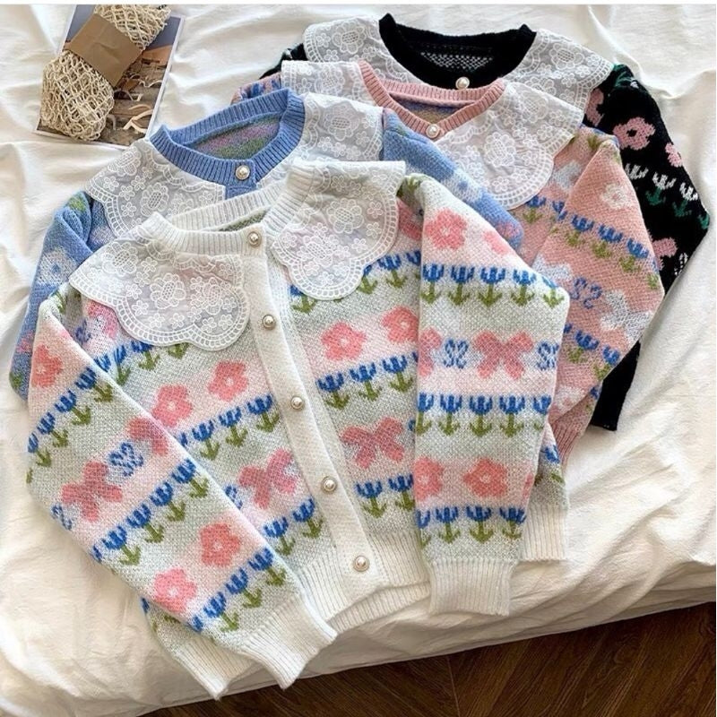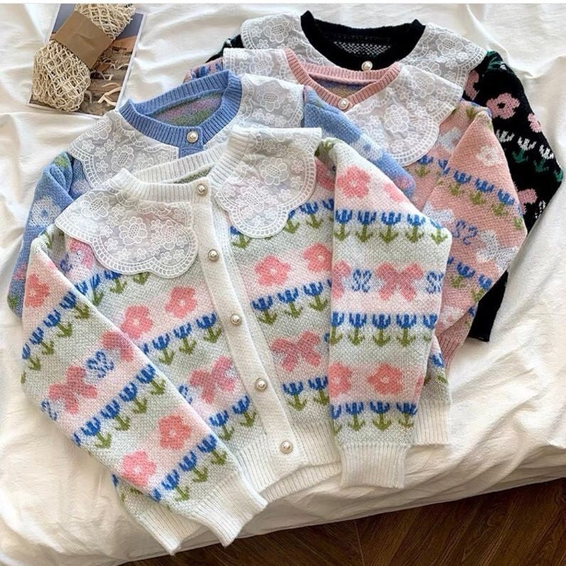 Jerseu confectionat din tricot moale, cu croi lejer, accesorizat cu detalii florale. Se inchide cu nasturi si are un guler lat cu broderie. Are borduri reiate late la mansete si la baza.