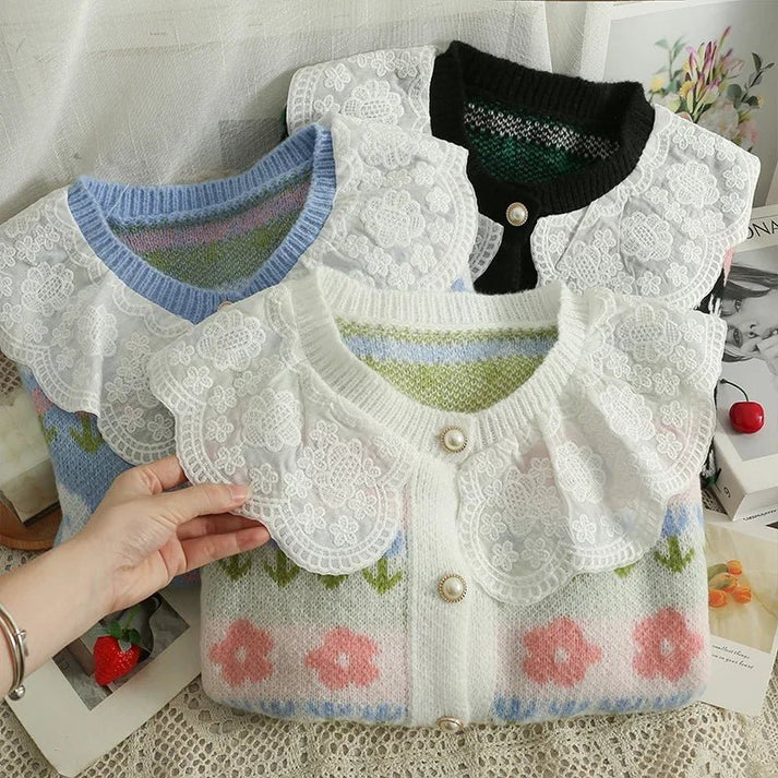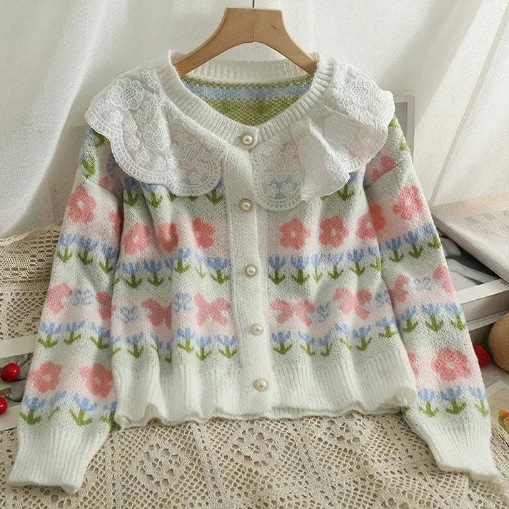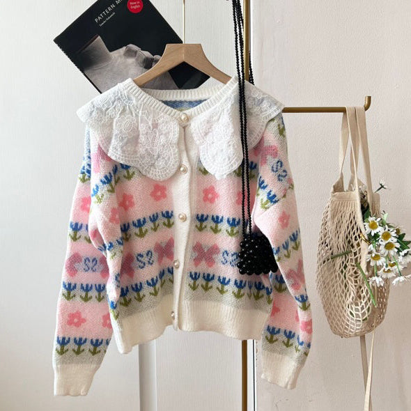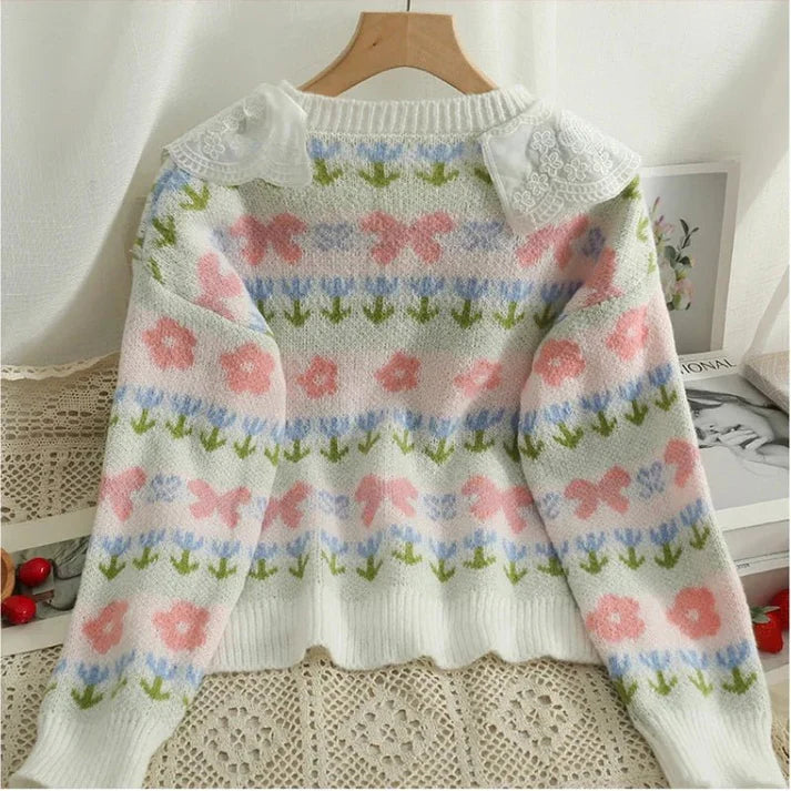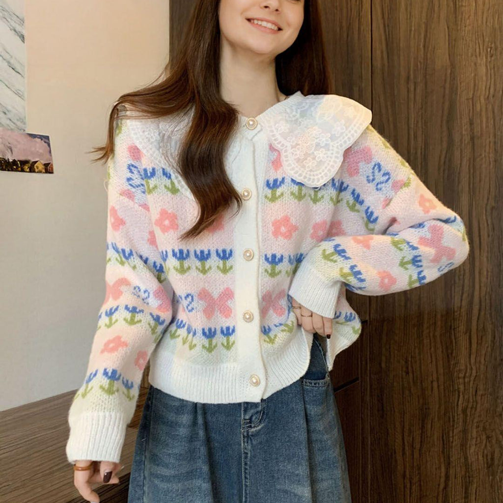 Jerseu confectionat din tricot moale, cu croi lejer, accesorizat cu detalii florale. Se inchide cu nasturi si are un guler lat cu broderie. Are borduri reiate late la mansete si la baza.