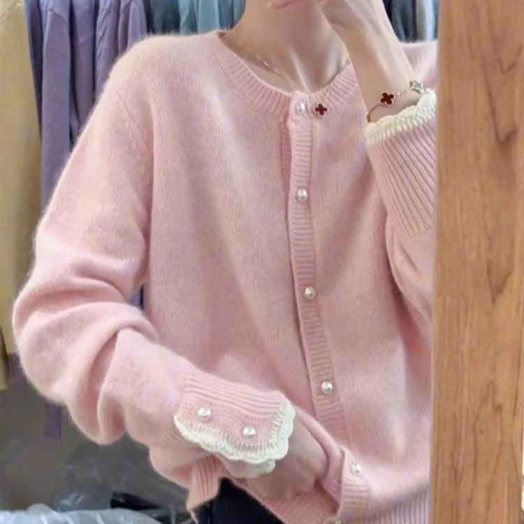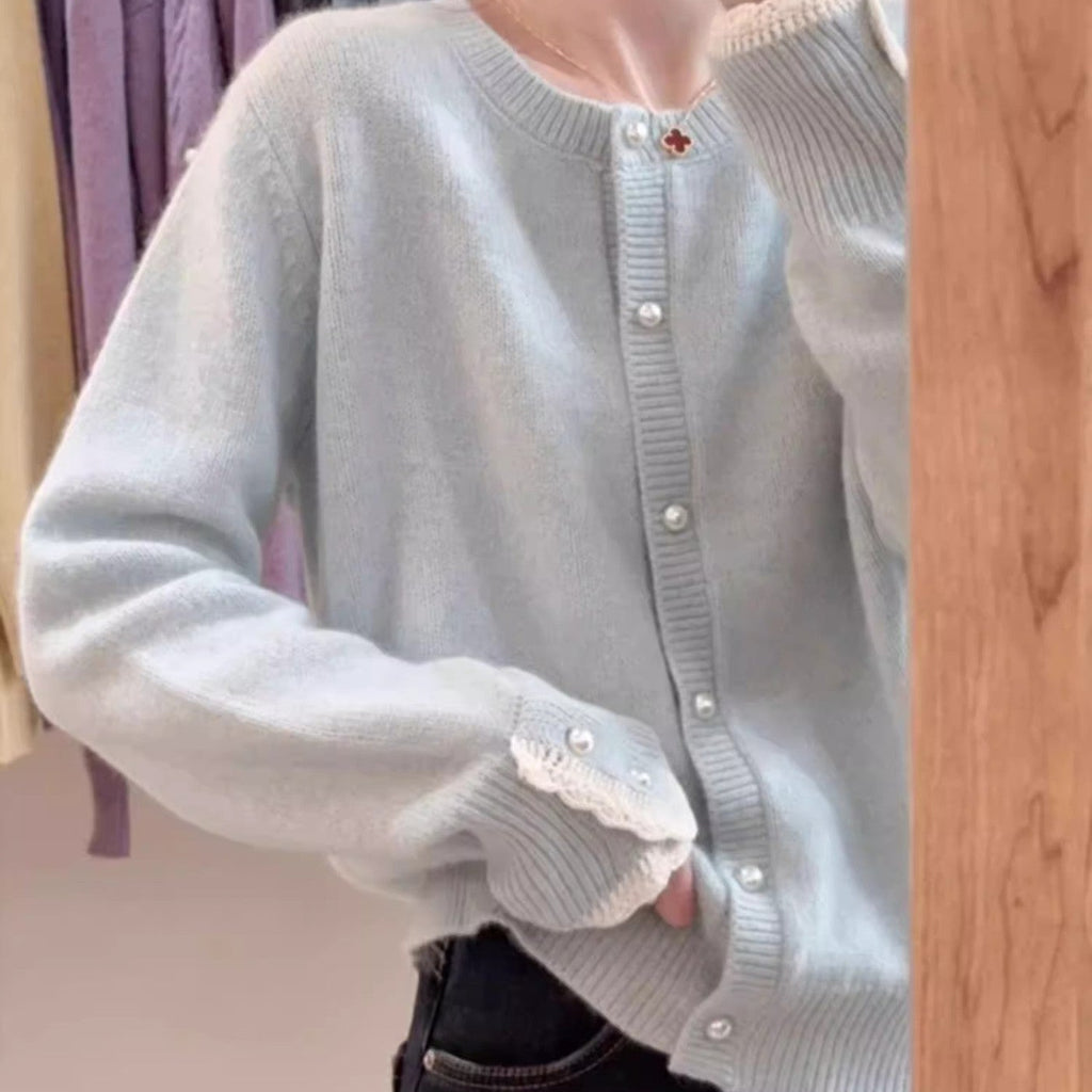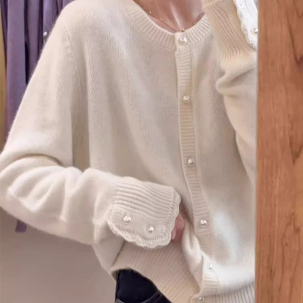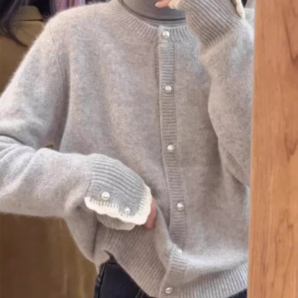 Jerseu confectionat din tricot moale, cu croi lejer. Se inchide cu nasturi, prezinta maneci lungi cu terminatii din dantela brodata.