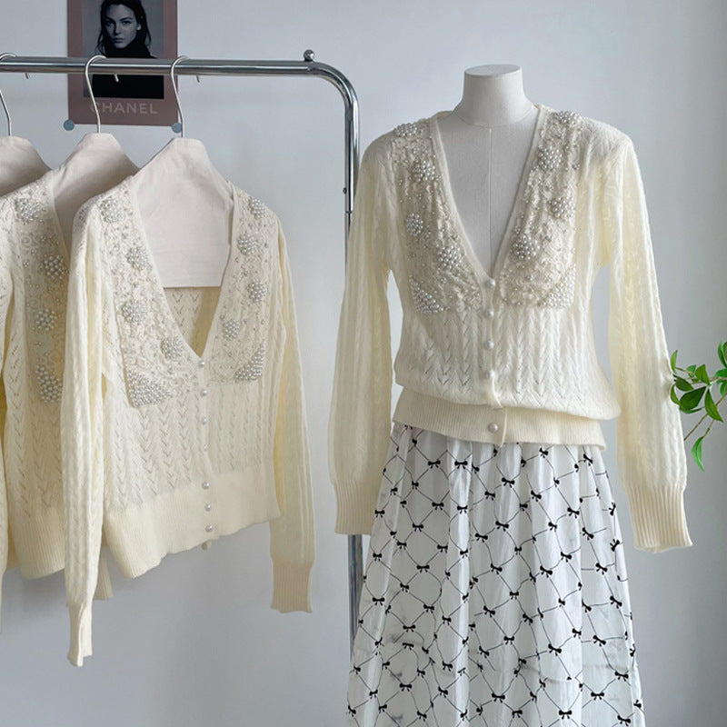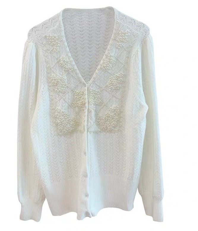 Jerseu stil casual-elegant confectionat din tricot moale, accesorizat cu perle si dantela. Mansetele si baza cardiganului sunt confectionate din tricot reiat. Se inchide cu nasturi eleganti tip perlute pe piept. Decolteu in V.