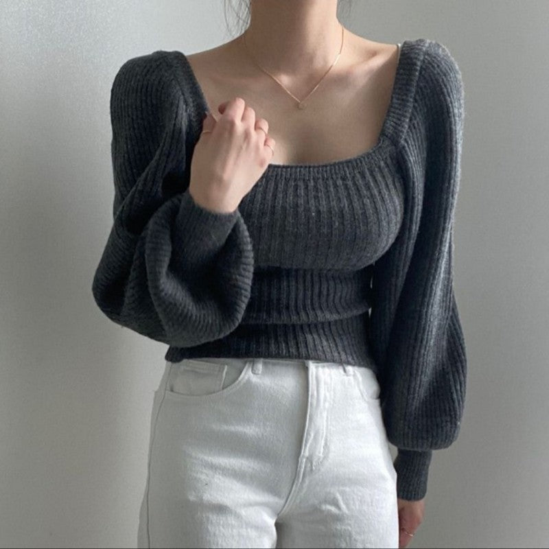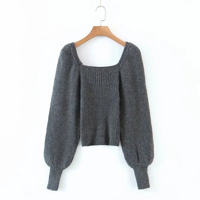 Pulover Maresa gri cu decolteu patrat si maneci bufante