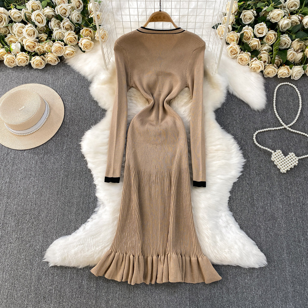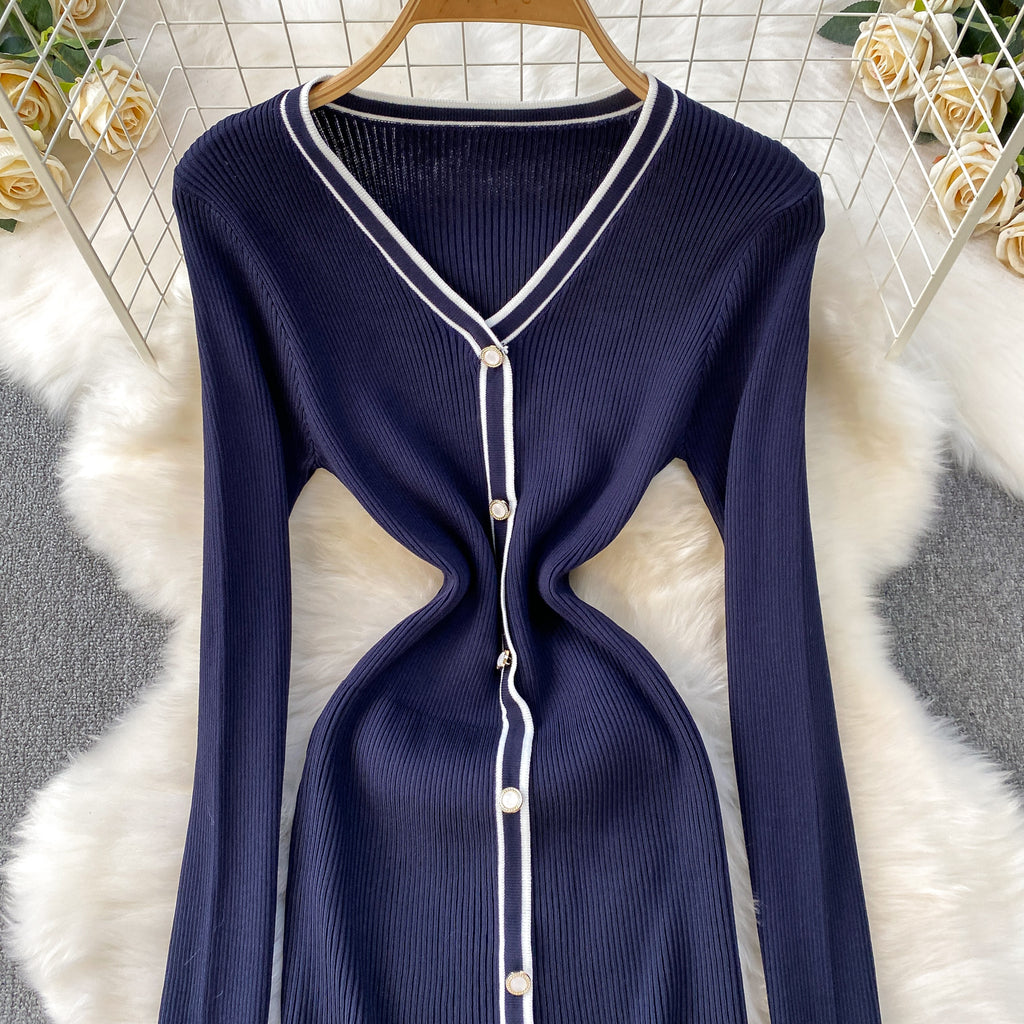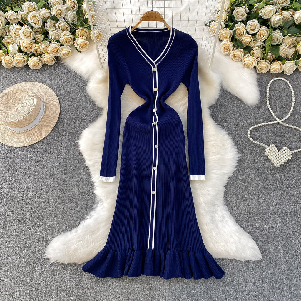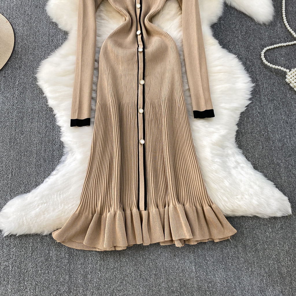 Rochie din tricot moale si elastic, calduroasa, cu o croiala tip A. Prezinta croi lejer cu detalii reiate, maneci lungi, iar in partea de sus prezinta decolteu in V continuat cu nasturi functionali.