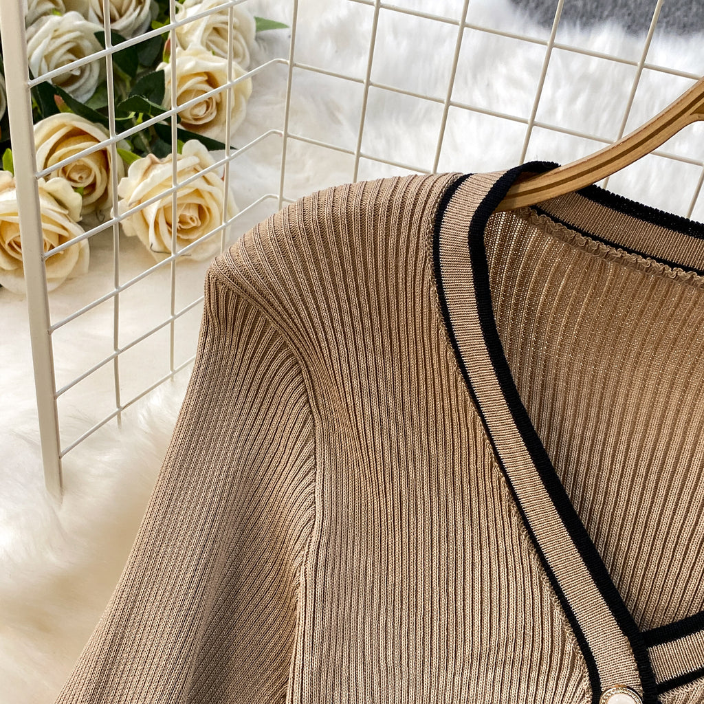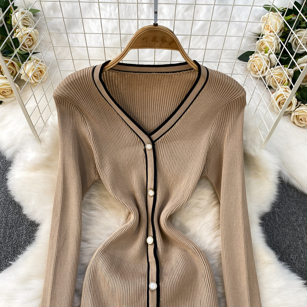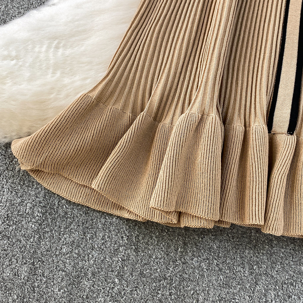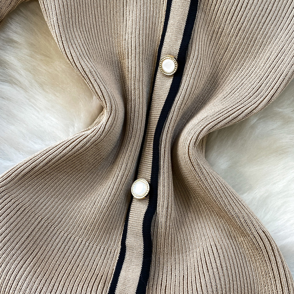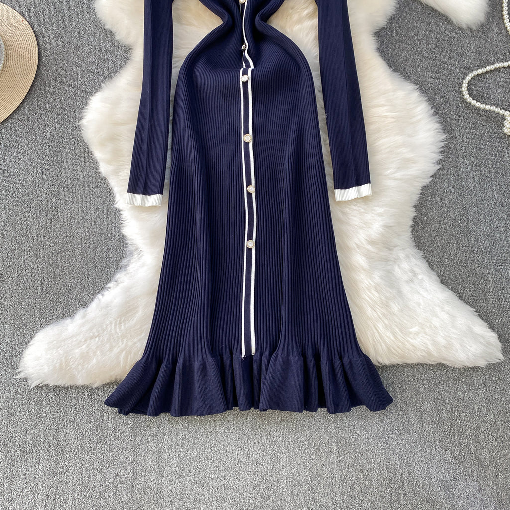 Rochie din tricot moale si elastic, calduroasa, cu o croiala tip A. Prezinta croi lejer cu detalii reiate, maneci lungi, iar in partea de sus prezinta decolteu in V continuat cu nasturi functionali.