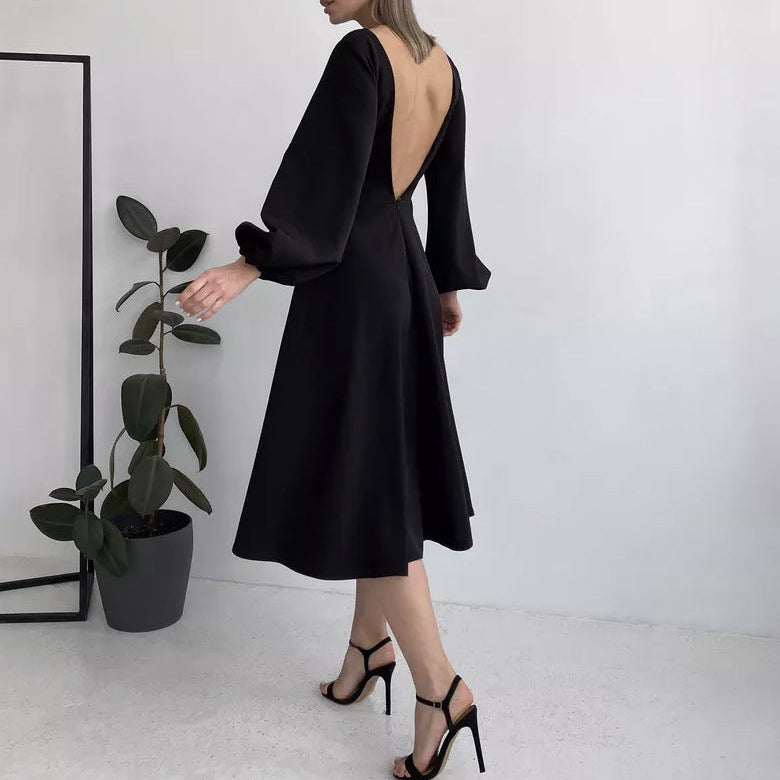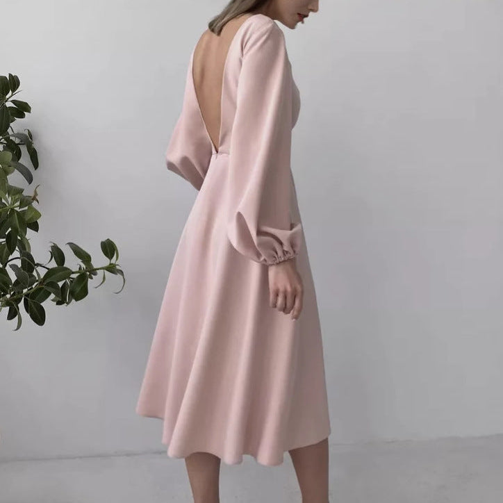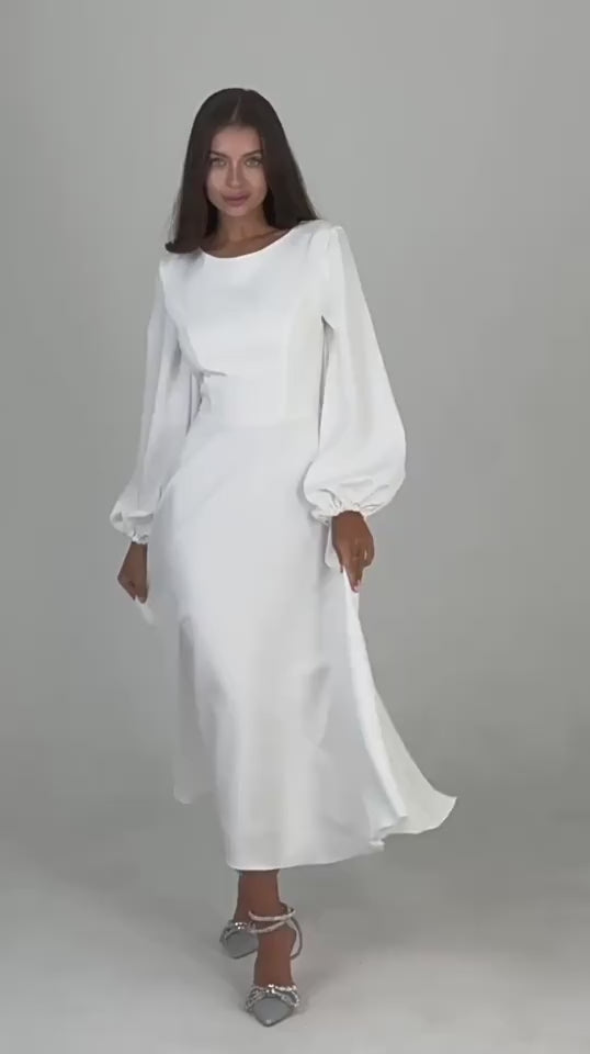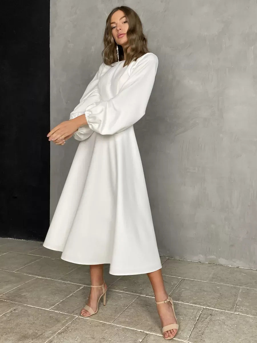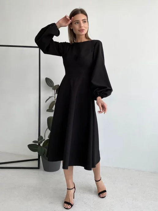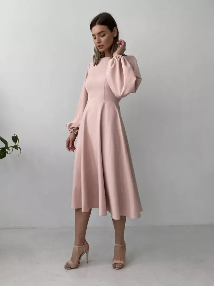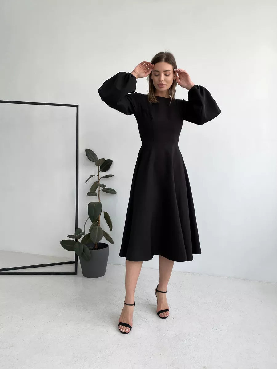 Rochie midi cu croi in A confectionata dintr-un material placut la atingere, are maneci lungi, bufante si mansete elastice. Decolteul este rotund iar la spate prezinta un decolteu adanc in V. Inchiderea se face cu fermoar ascuns la spate. Rochia prezinta jupon atasat.