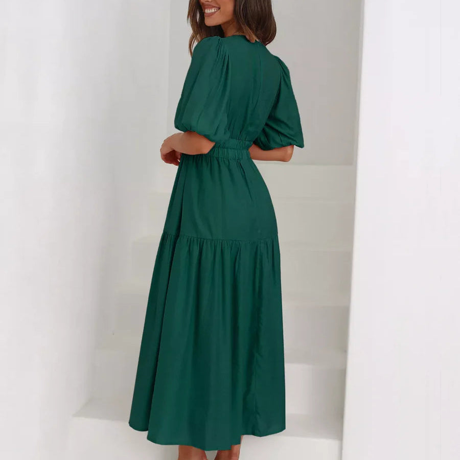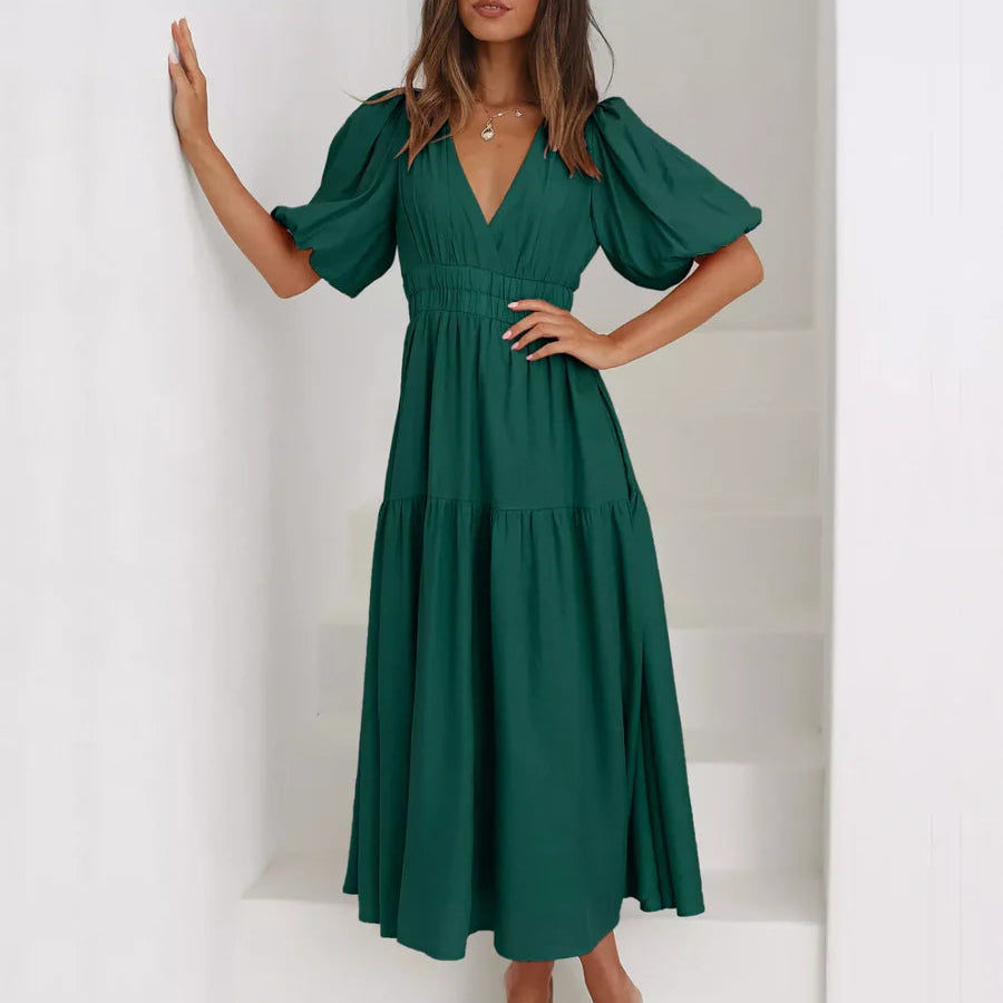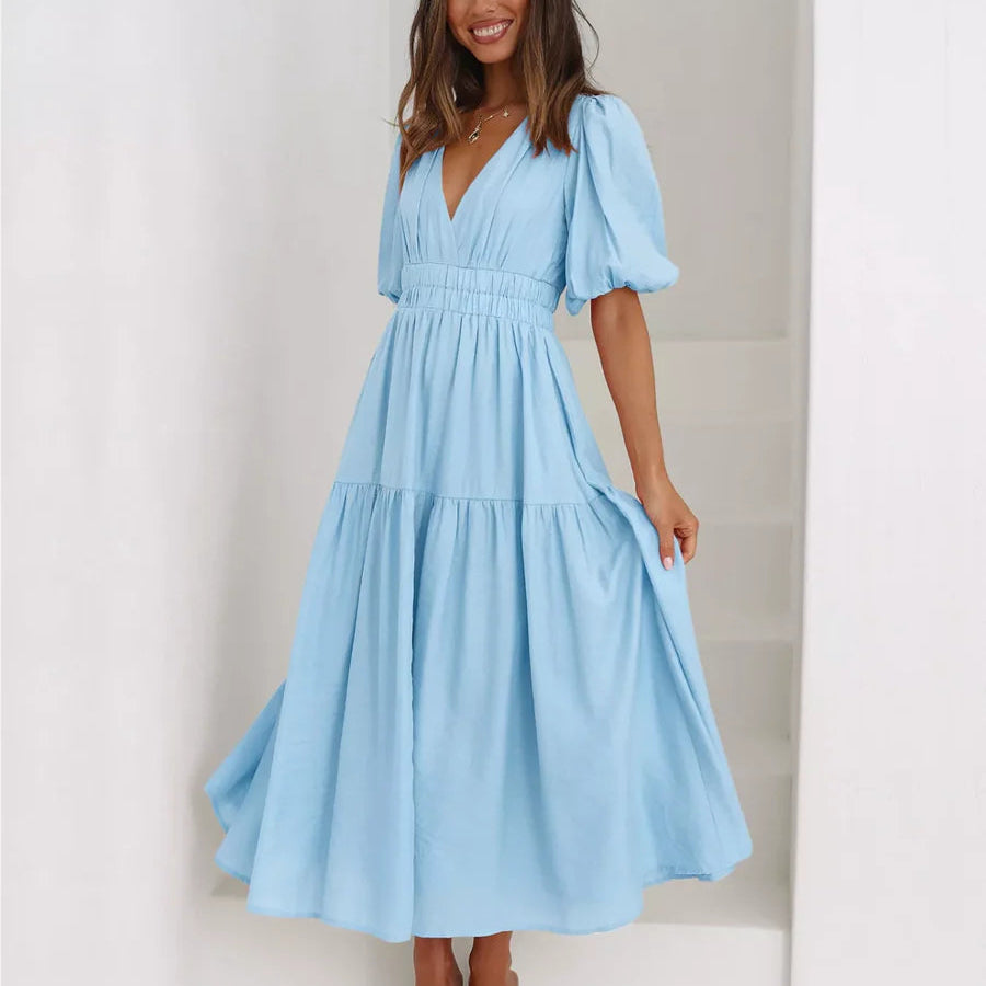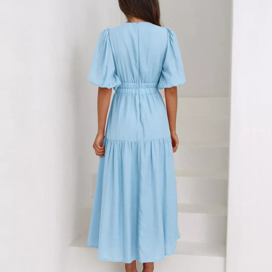Rochie cu decolteu in V, cu maneci scurte cu mansete elastice, umeri bufanti si talie elastica.
