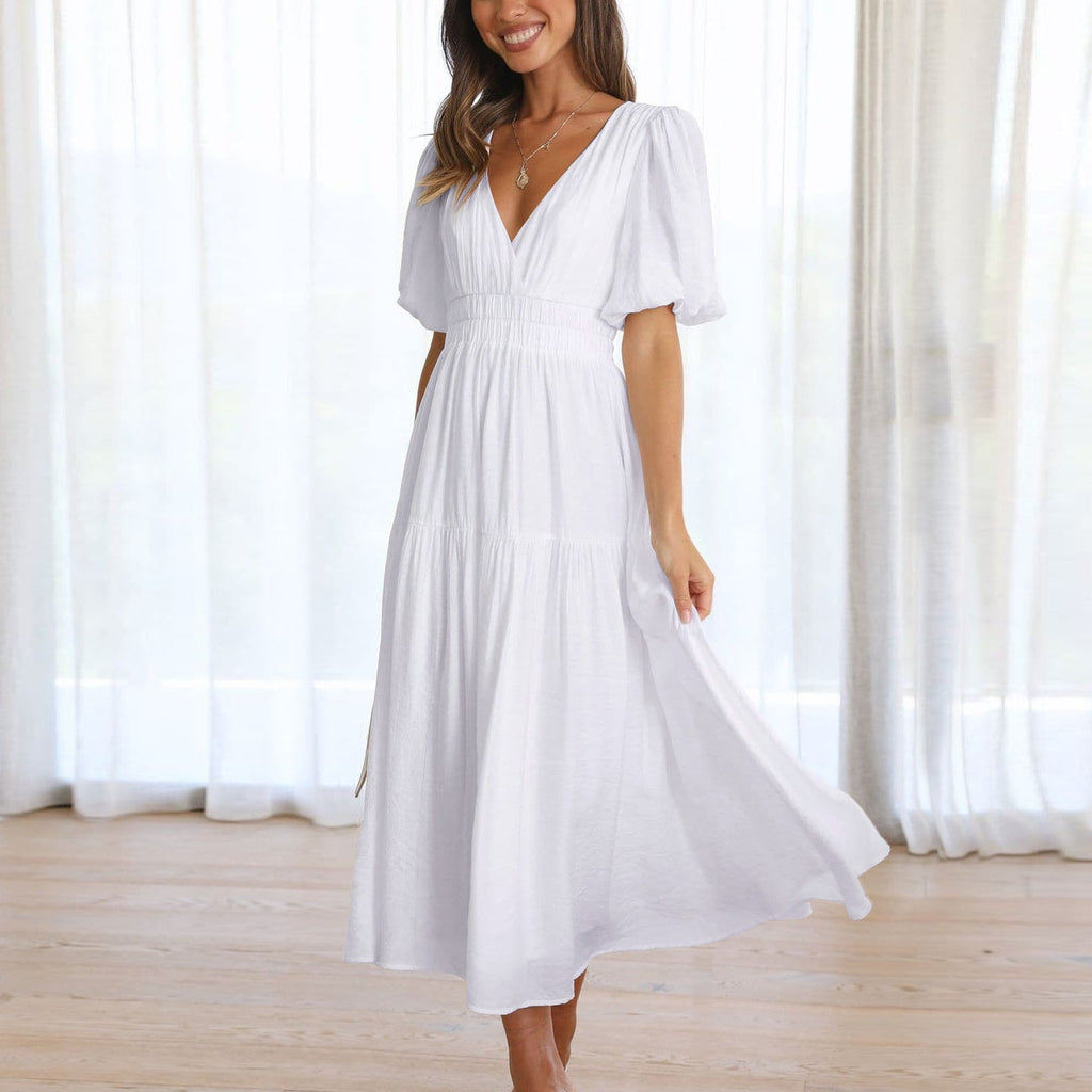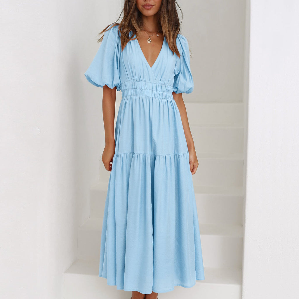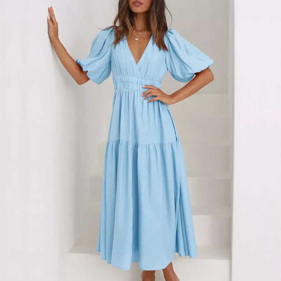Rochie cu decolteu in V, cu maneci scurte cu mansete elastice, umeri bufanti si talie elastica.