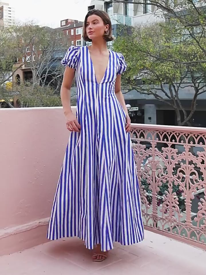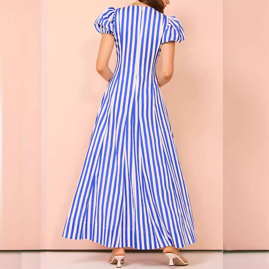 Rochie midi stil casual-chic confectionata dintr-un material placut la atingere, imprimeu in dungi si maneci scurte bufante. Decolteul este in V.