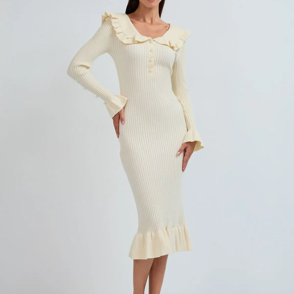 Rochie midi confectionata din tricot, motiv picior de cocos. Are decolteu in V, maneci lungi cu manseta lata, buzunare false. E accesorizata cu nasturi argintii stralucitori.