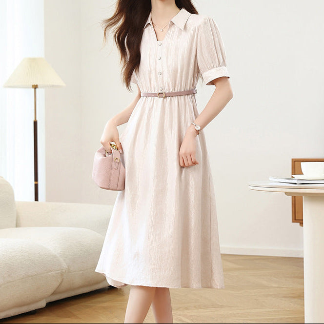 Rochie cu croiala lejera, are maneci scurte, elastic in talie, guler tip camasa si nasturi in fata. Prezinta curea accesorizata in talie.