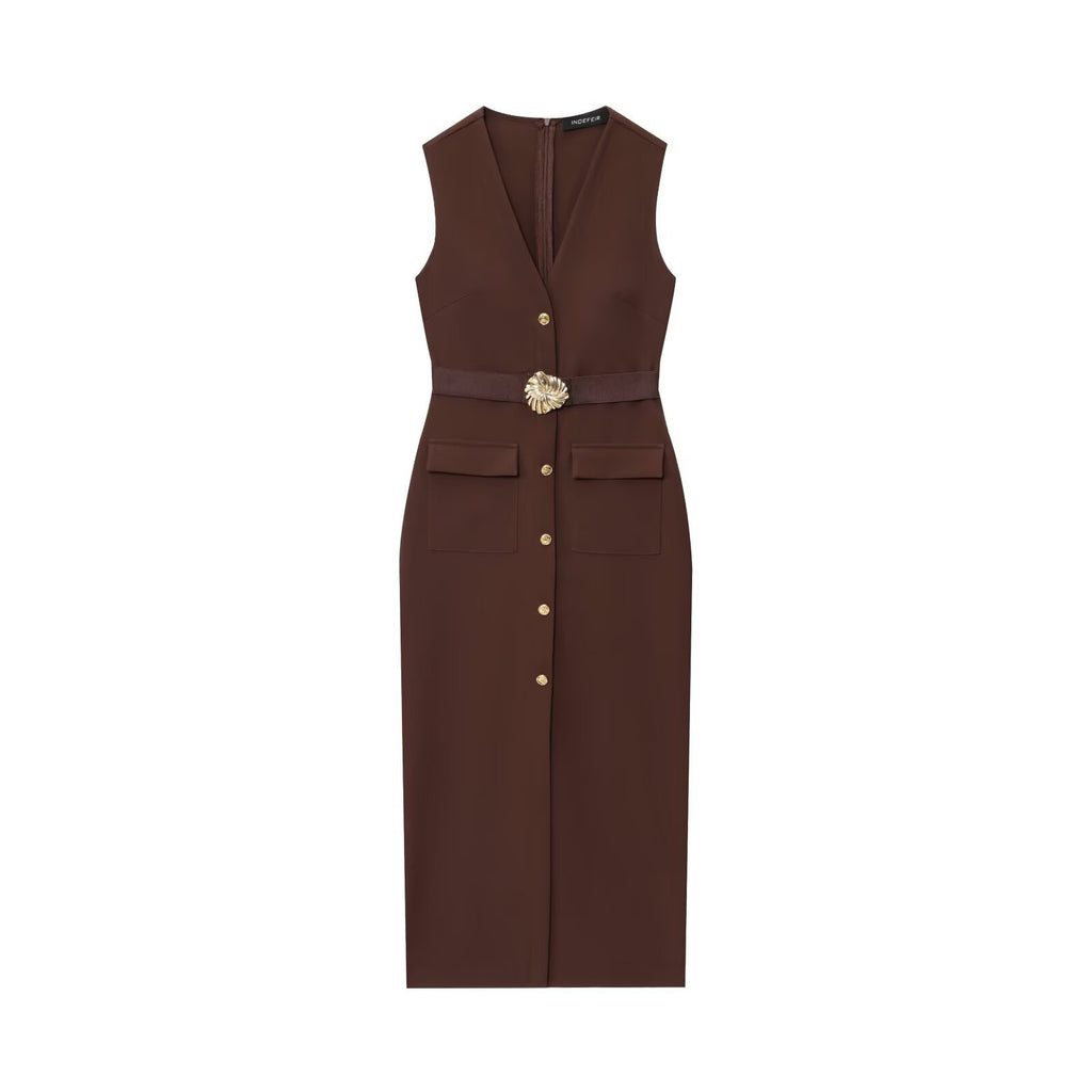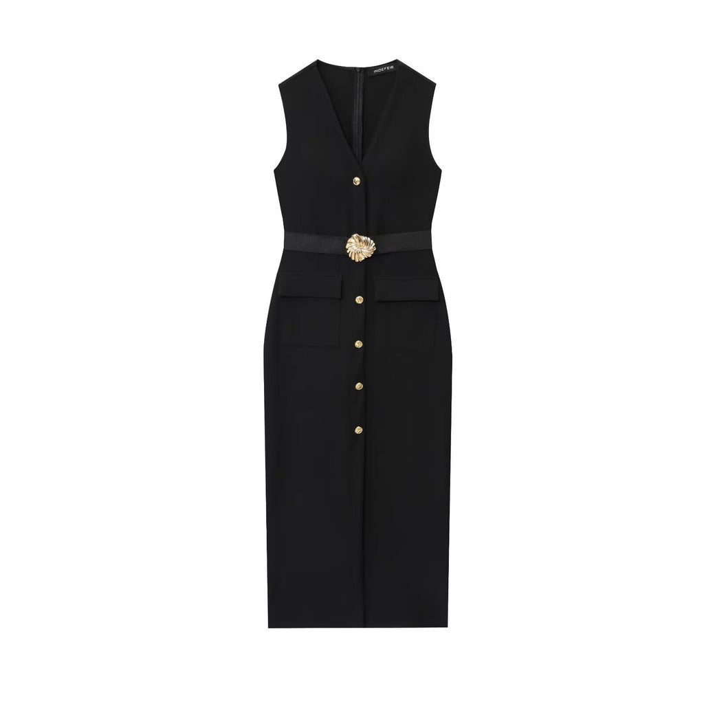 Rochie midi cu croi tip creion, decolteu in V continuat cu nasturi nefunctionali si fermoar ascuns la spate. Talia este evidentiata printr-o curea din acelasi material cu catarama. Este un model elegant, potrivit atat pentru o cina in oras cat si pentru un eveniment important.