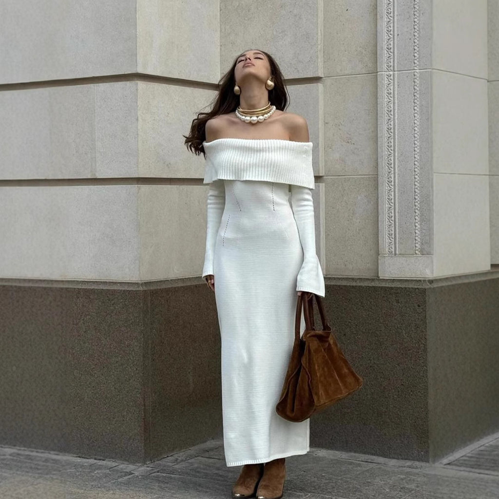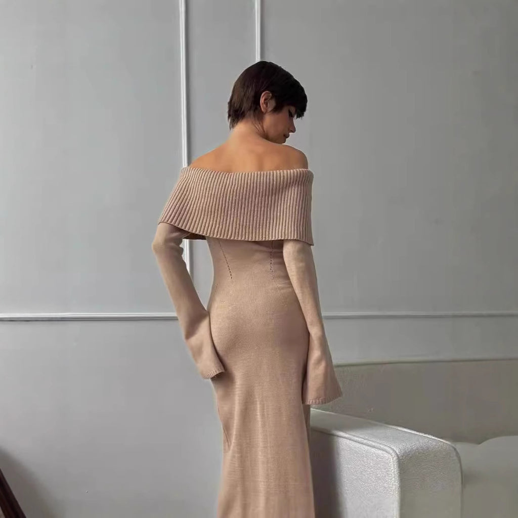 Descoperă eleganța tricotului într-o rochie cu croi midi și talie bine definită. Rochia lasă umerii liberi, iar banda discretă subliniaza decolteul tip barcuta — un detaliu care atrage privirea fără a striga. Tesătura elastică din acrilic se mulează ușor pe siluetă fără să strângă, oferind confort de lungă durată.