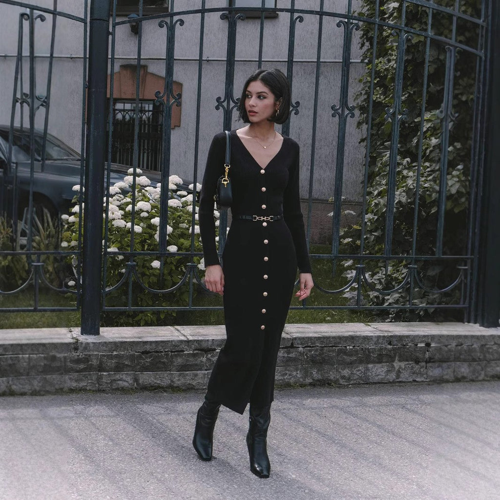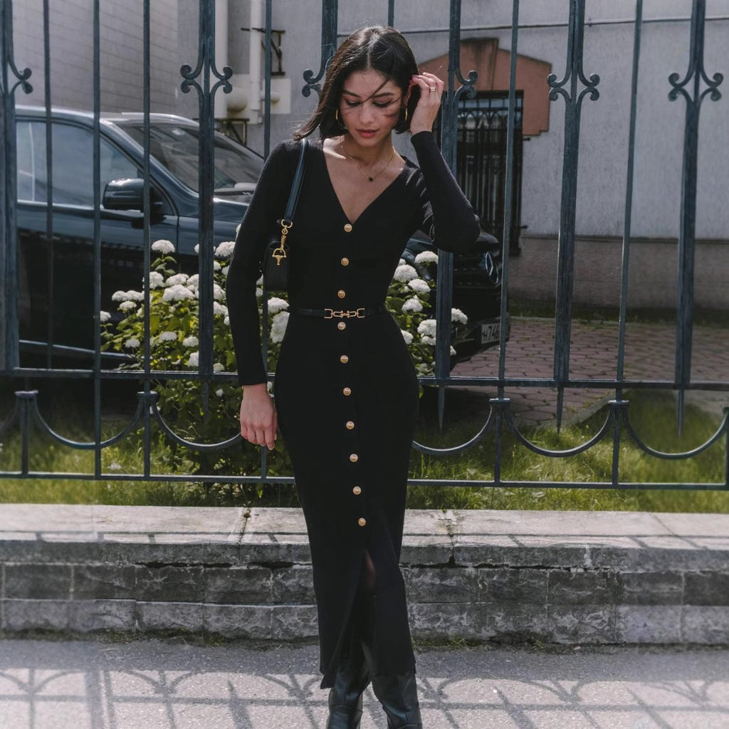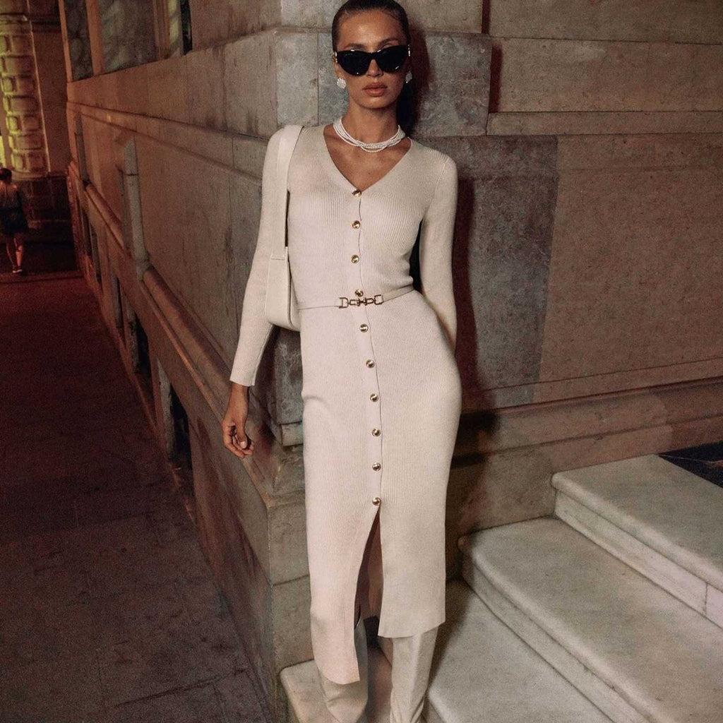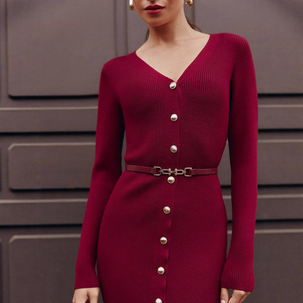Rochie din tricot moale si elastic, calduroasa, cu o croi mulat. Prezinta detalii reiate, maneci lungi, iar in partea de sus prezinta decolteu in V. Cureaua este inclusa