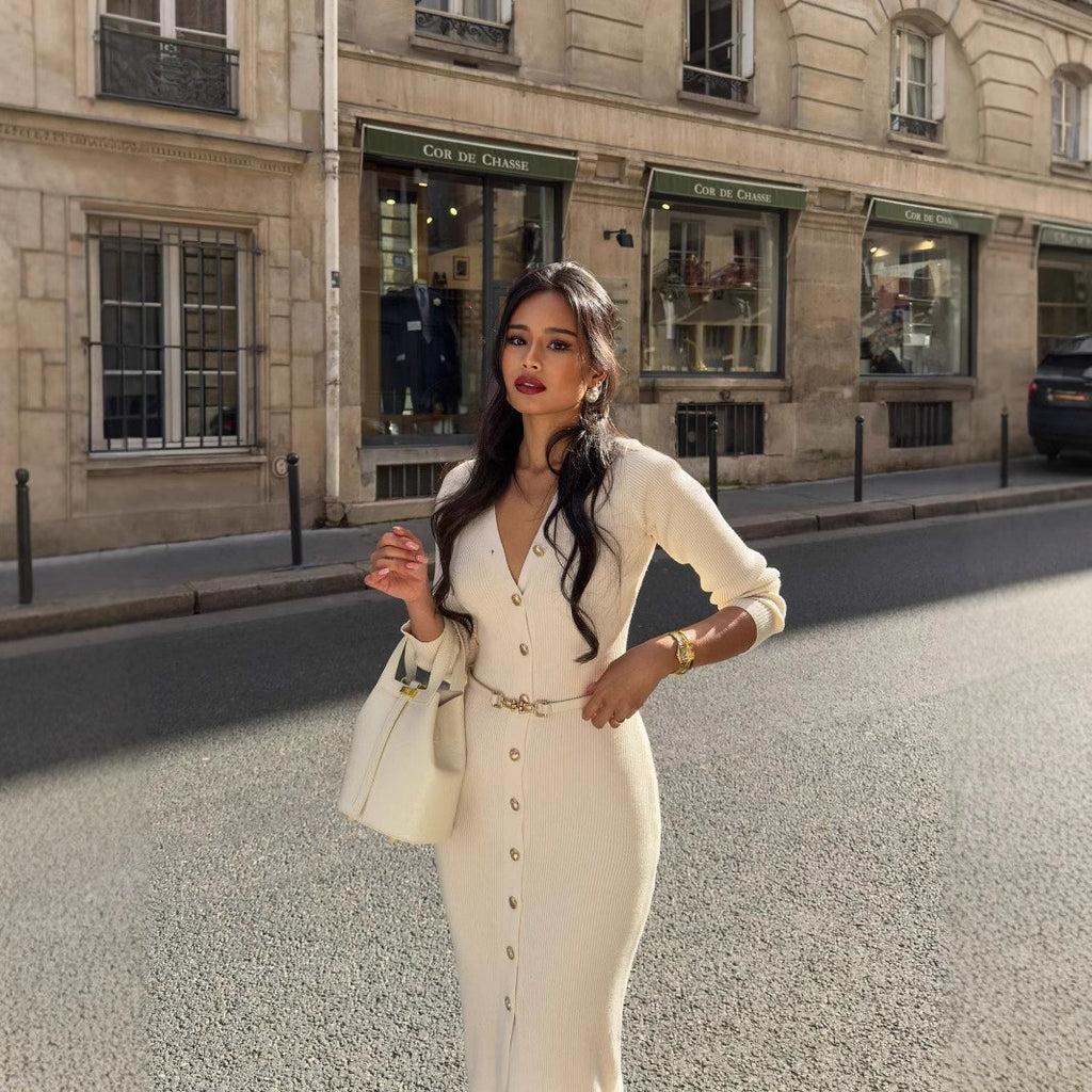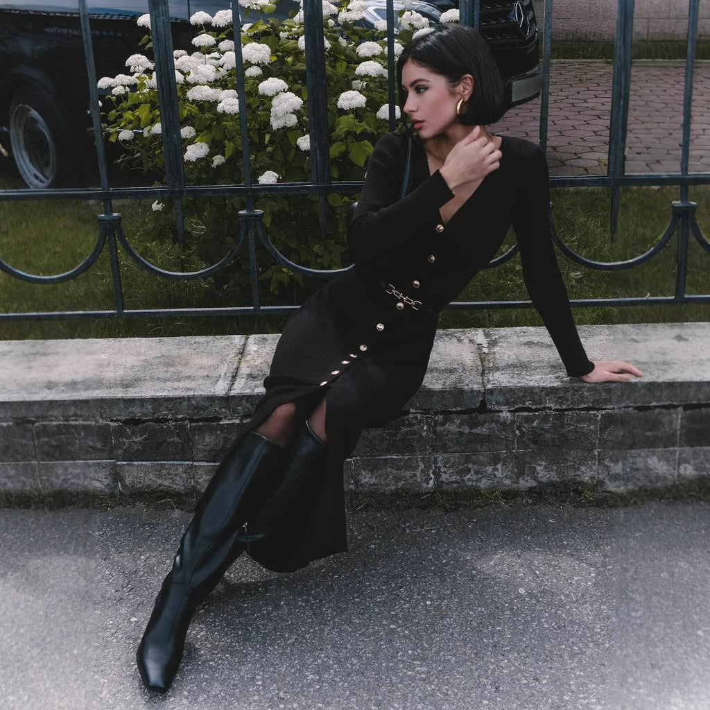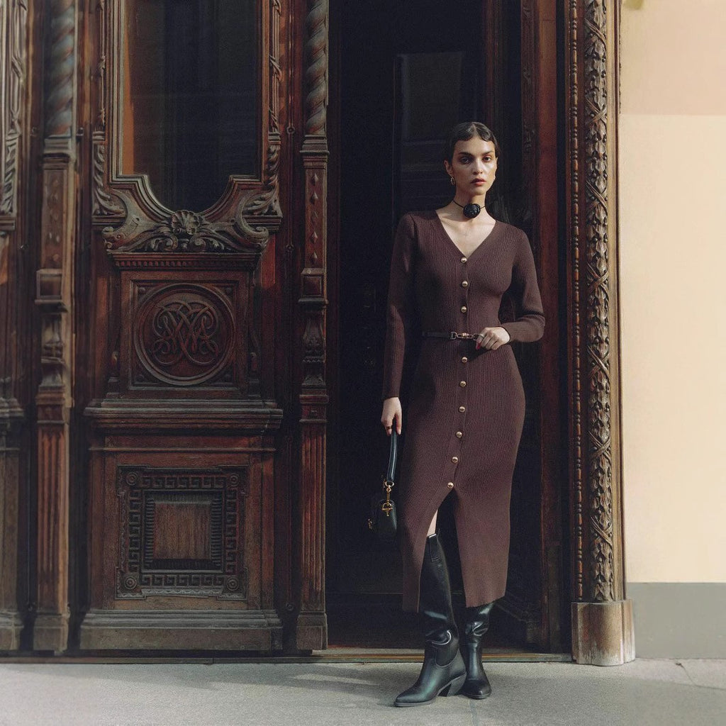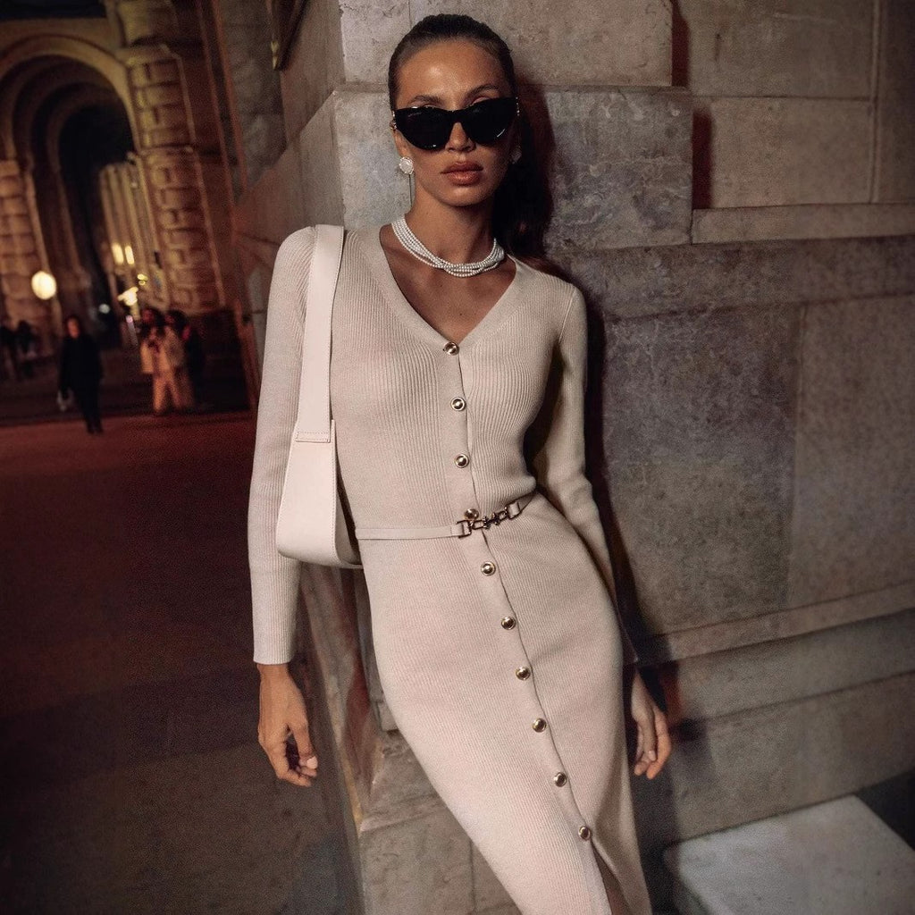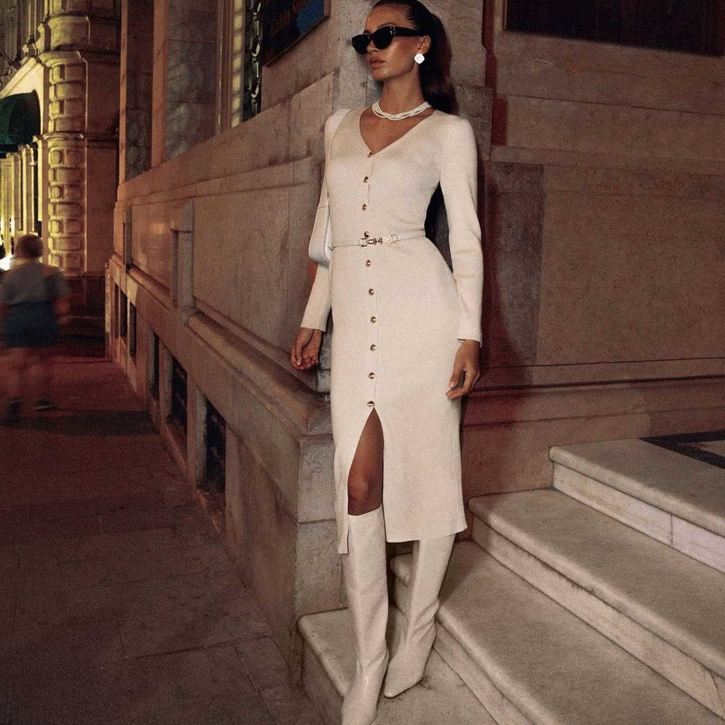 Rochie din tricot moale si elastic, calduroasa, cu o croi mulat. Prezinta detalii reiate, maneci lungi, iar in partea de sus prezinta decolteu in V. Cureaua este inclusa