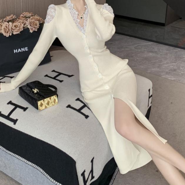 Rochie mulata din tricot reiat. Lungime midi, maneci lungi cu umeri goi, material placut la atingere, inchidere prin nasturi si dantela in zona umerilor
