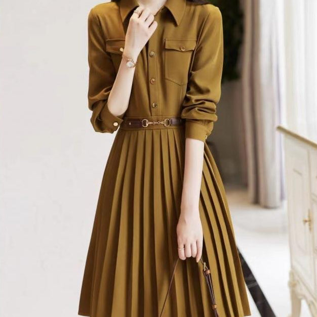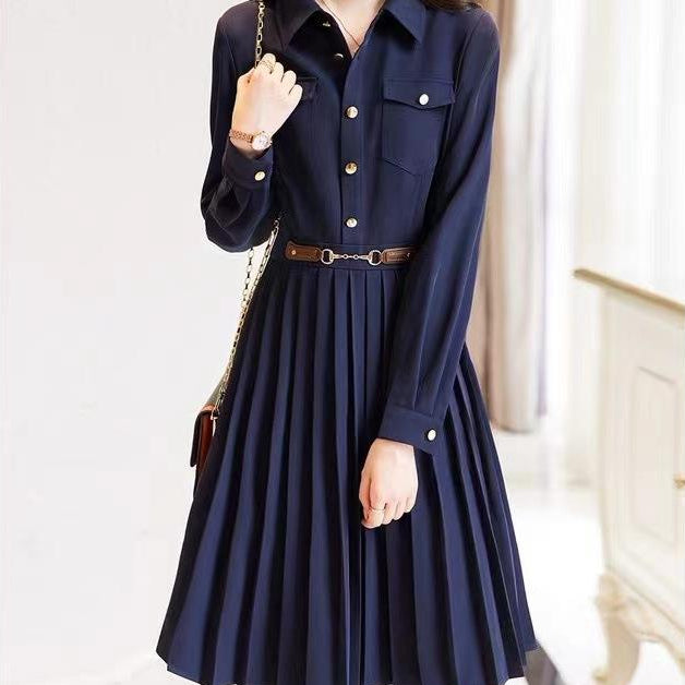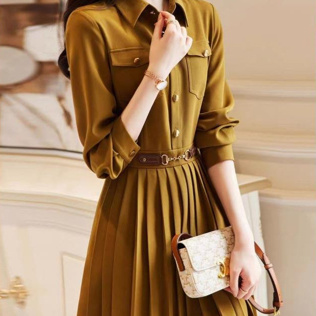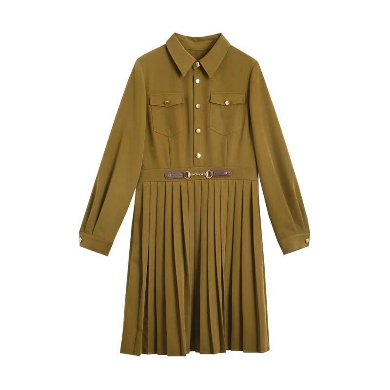 Rochie midi cu croiala in clos, plisata. Se inchide cu nasturi in partea din fata si fermoar lateral. Are maneci lungi cu manseta lata care se inchide cu nasturi.