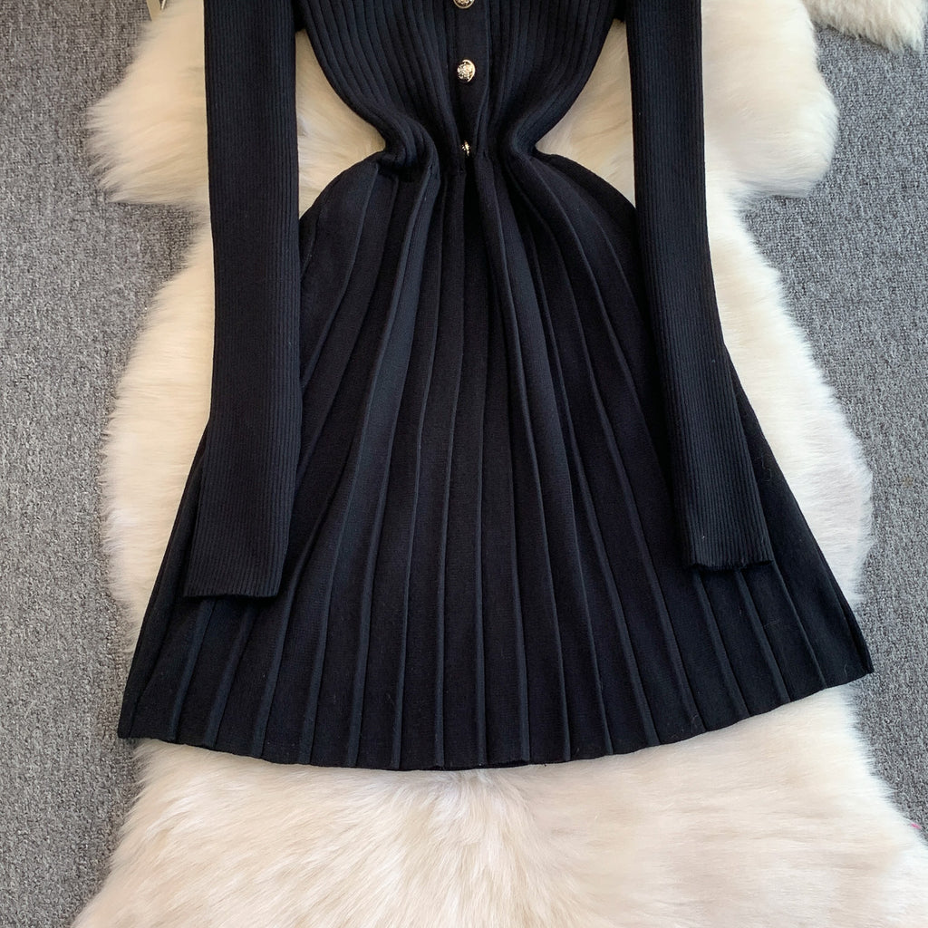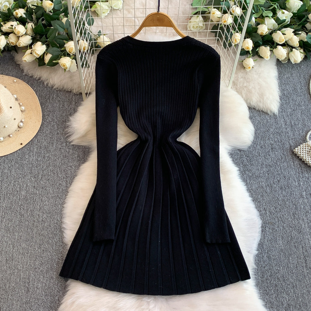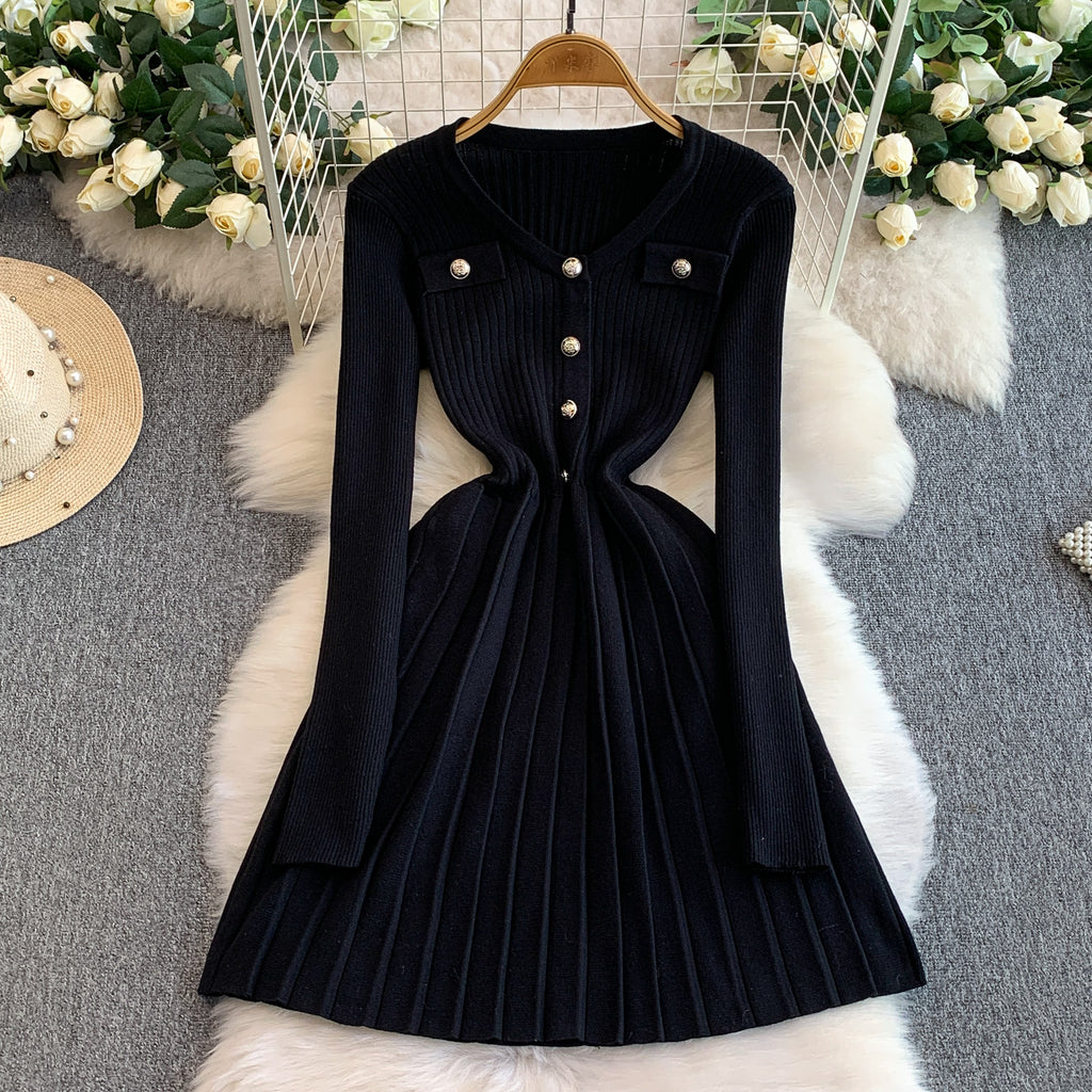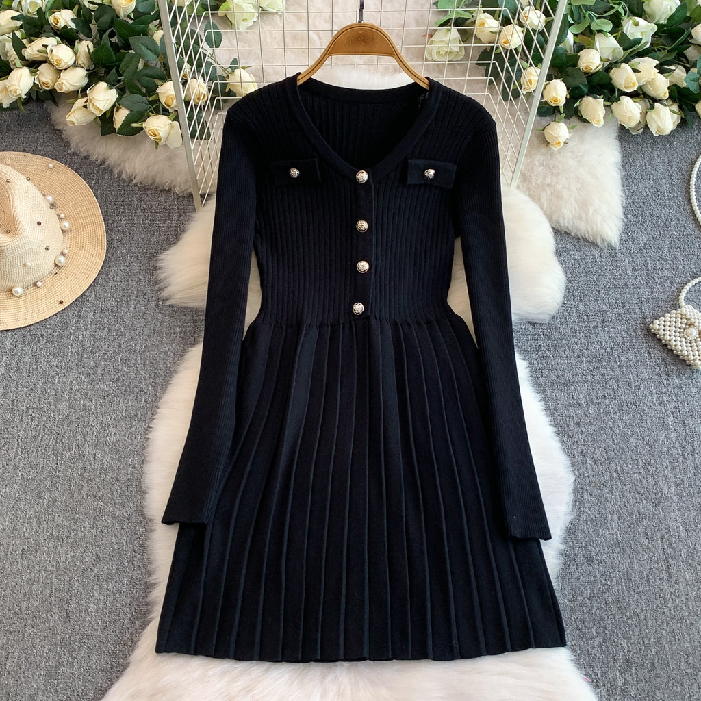 Rochie din tricot moale si elastic, calduroasa, cu o croiala tip A. Prezinta croi lejer cu detalii reiate, maneci lungi cu mansete late, iar in partea de sus prezinta decolteu in V