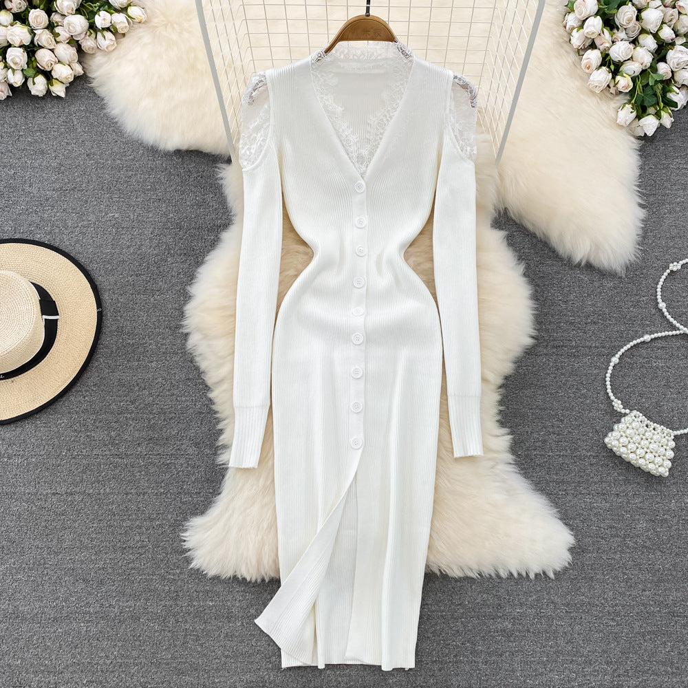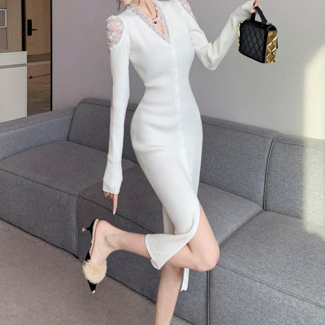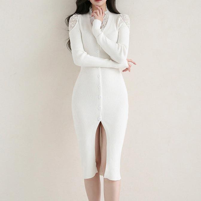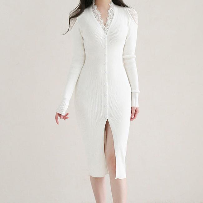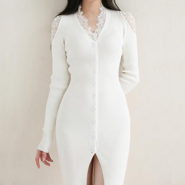 Rochie mulata din tricot reiat. Lungime midi, maneci lungi cu umeri goi, material placut la atingere, inchidere prin nasturi si dantela in zona umerilor