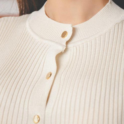 Rochie mulata din tricot reiat, de lungime midi. Are maneci lungi, e pe gat si se inchide cu capse in fata. Este accesorizata cu o curea in talie. E perfecta pentru un stil casual-elegant.