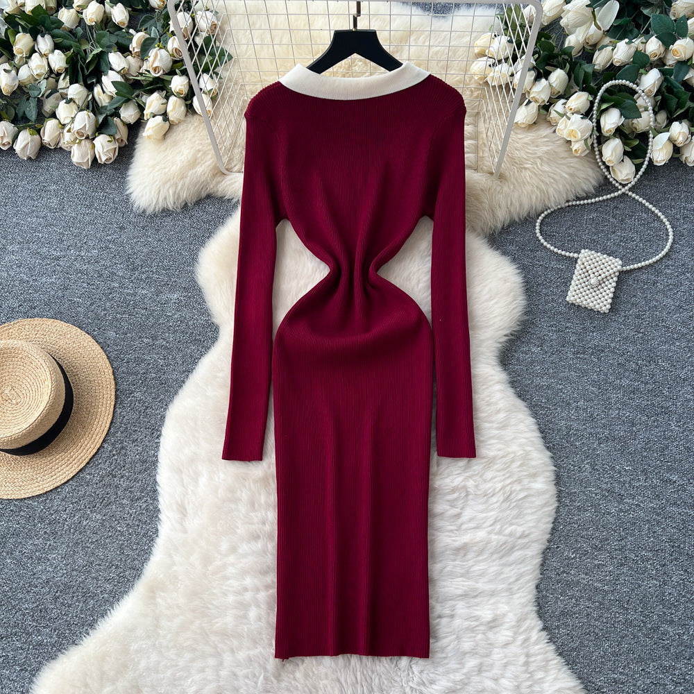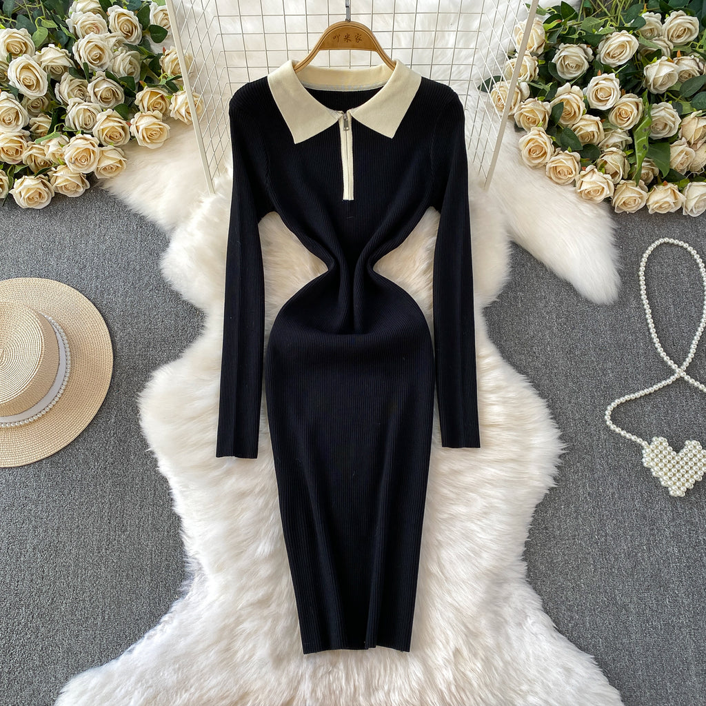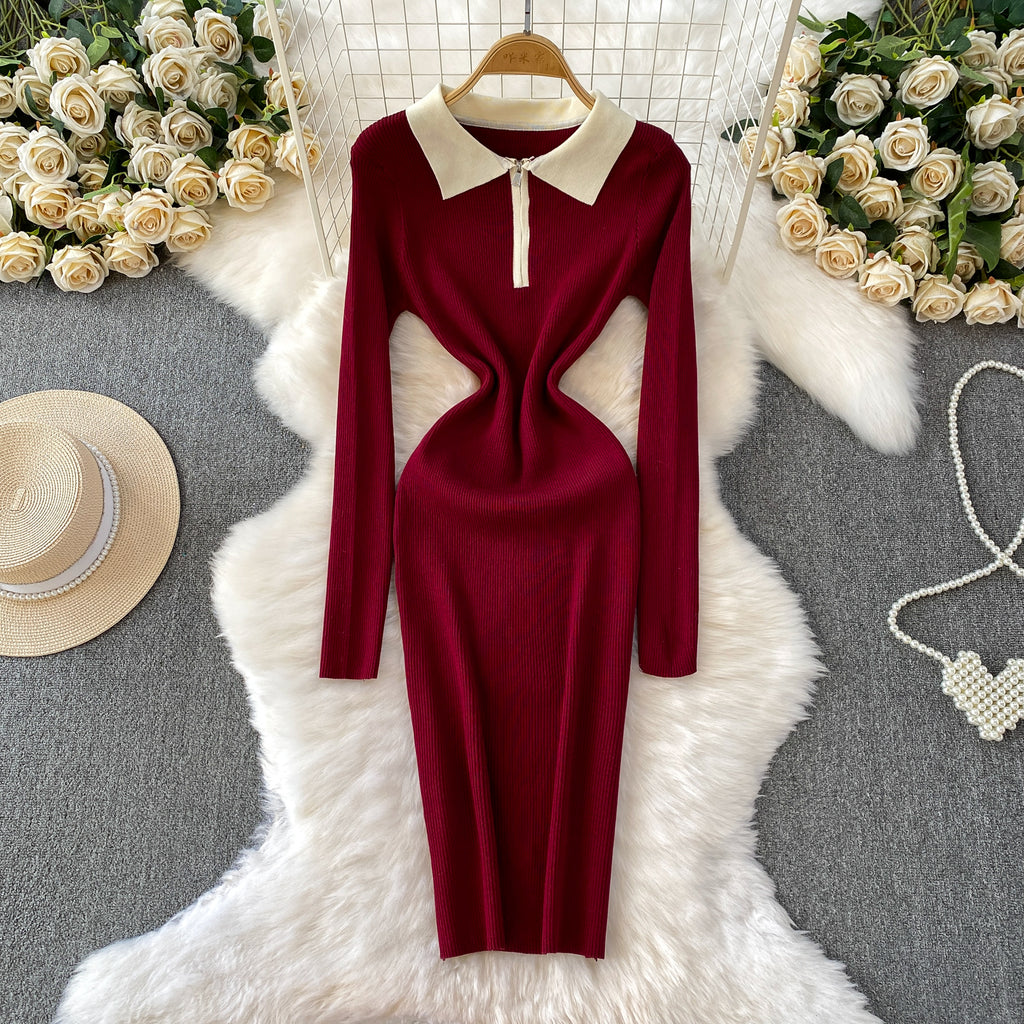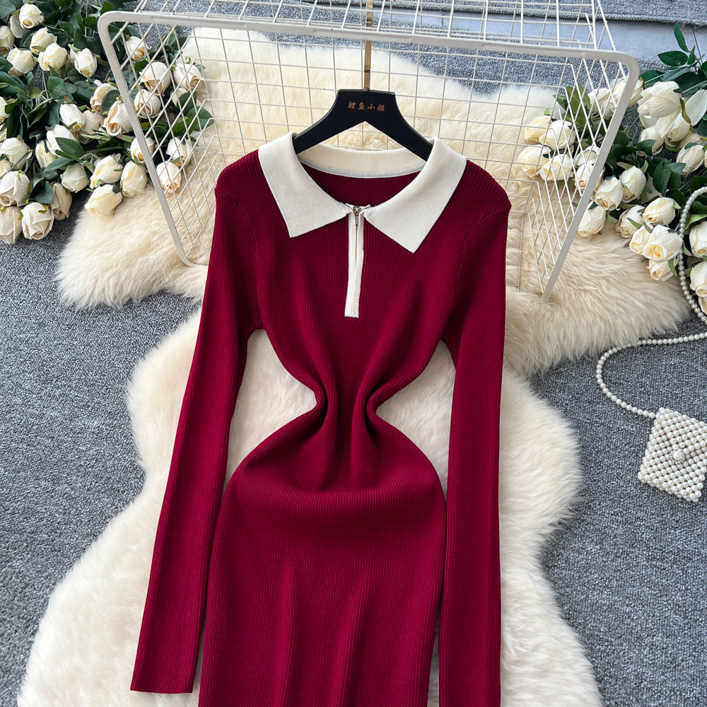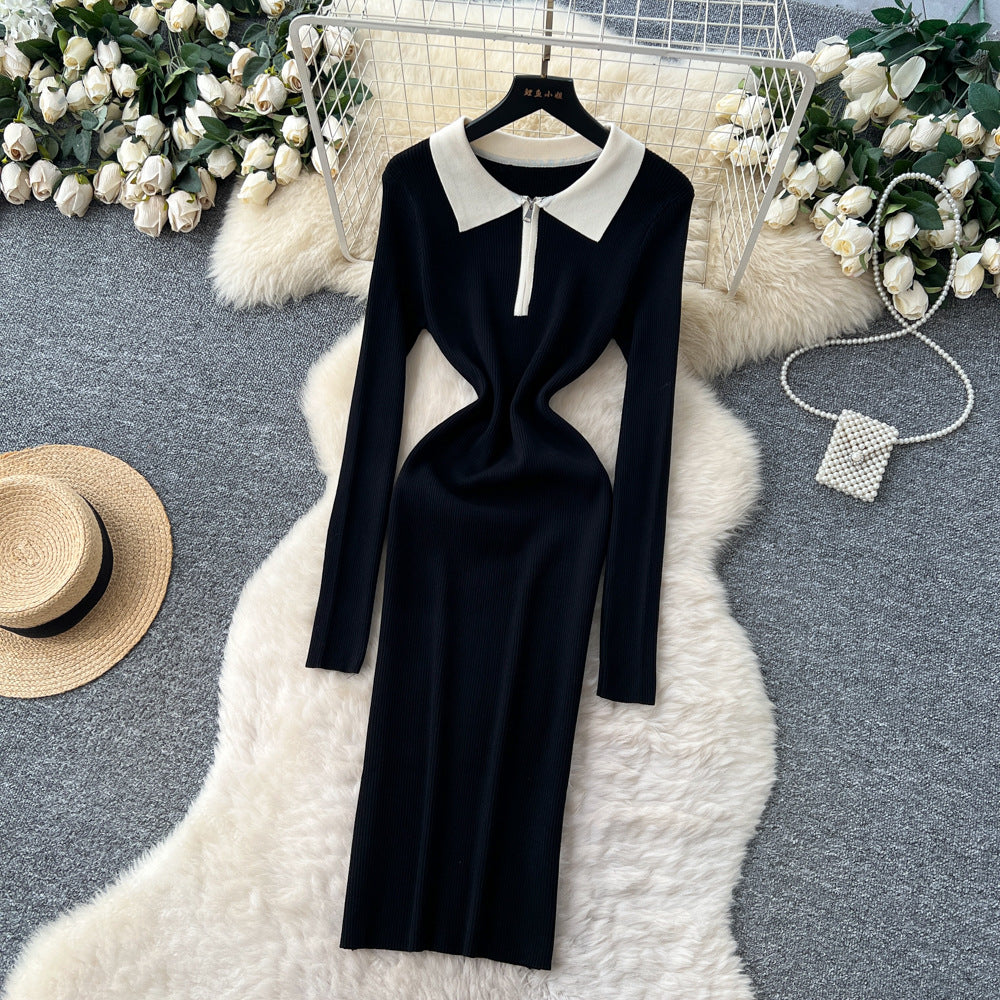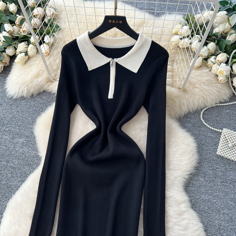 Rochie polo cu mâneci lungi și guler cu fermoar. Modelul prezintă un bordură contrastantă.