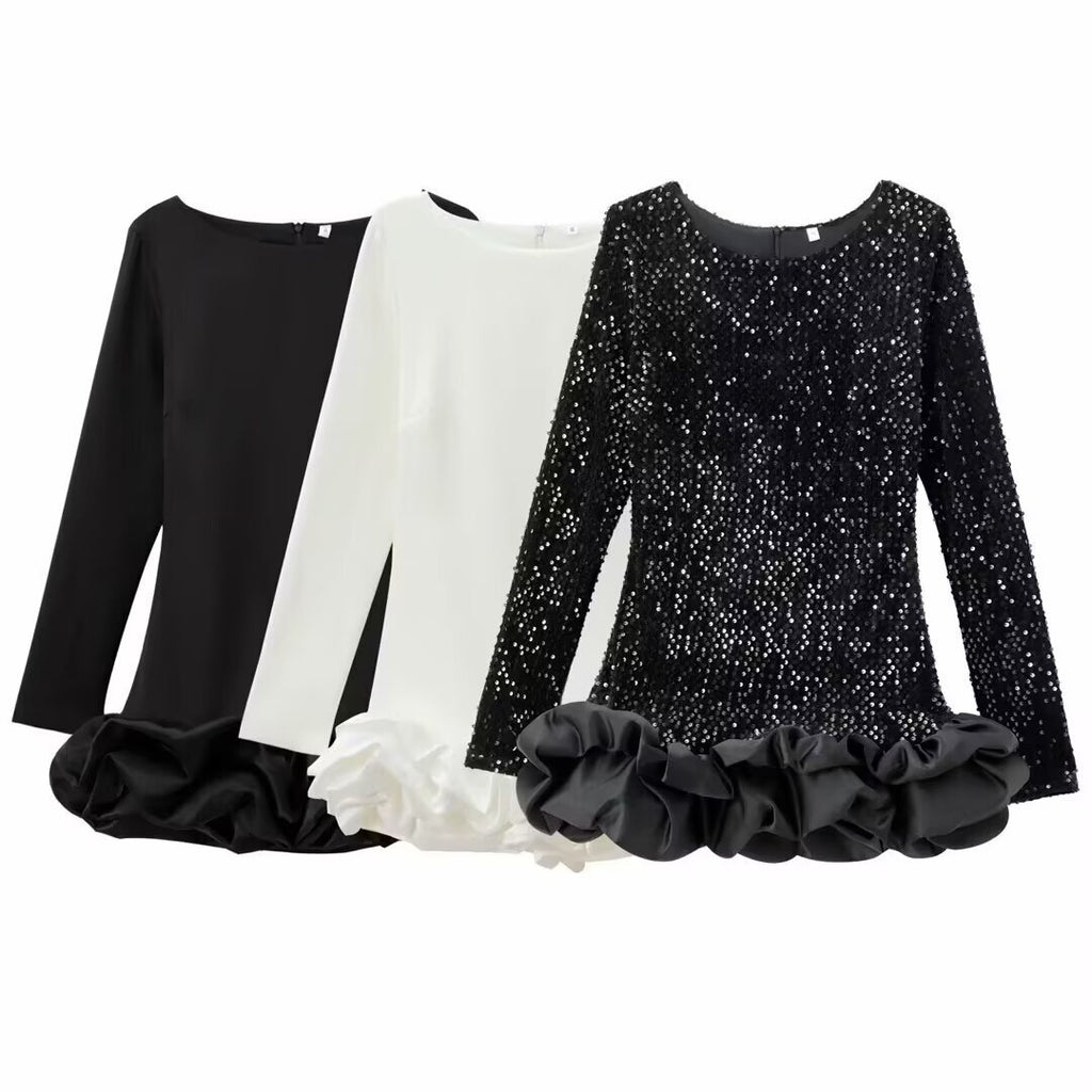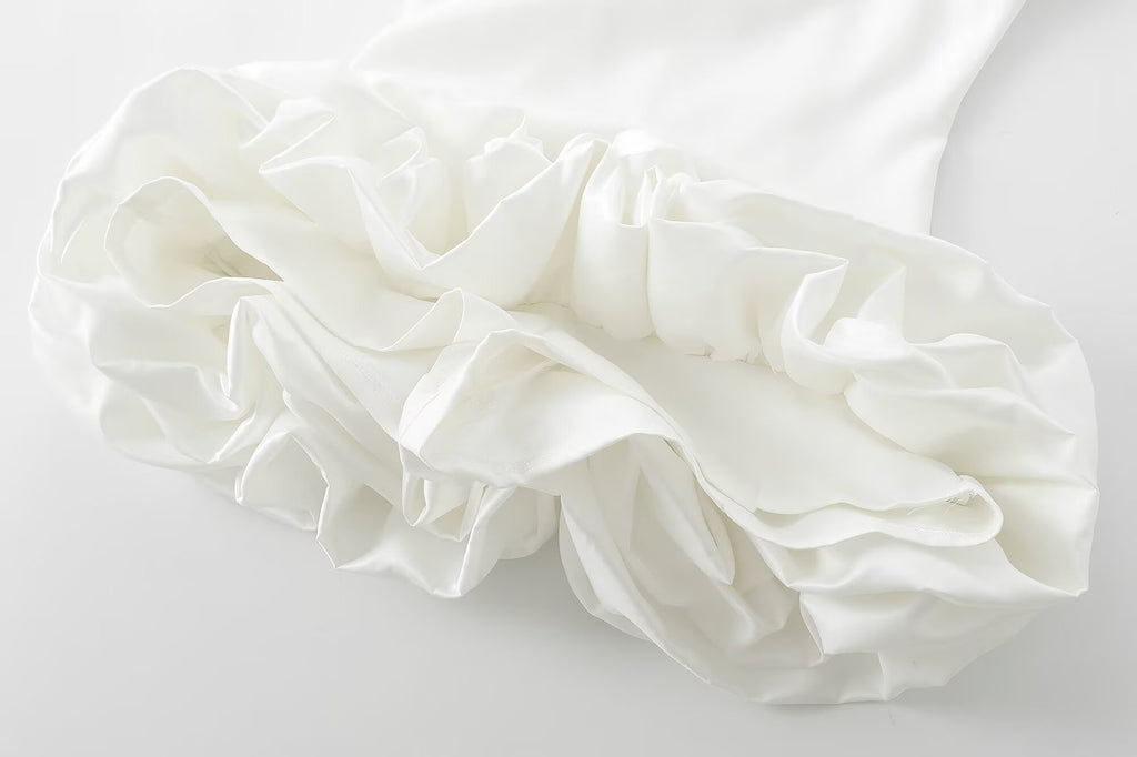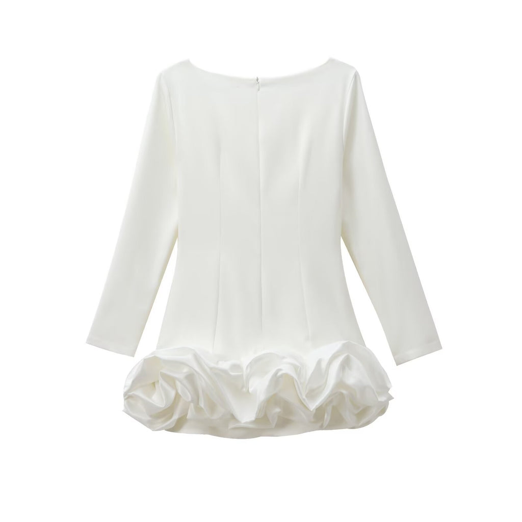 Rochia prezinta inchidere prin fermoar la spate, captuseala, volanase bufante la terminatii si pantaloni scurti. Croiul este usor in A, prezinta decolteul rotund, maneci lungi.