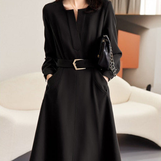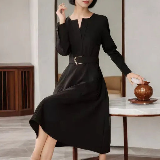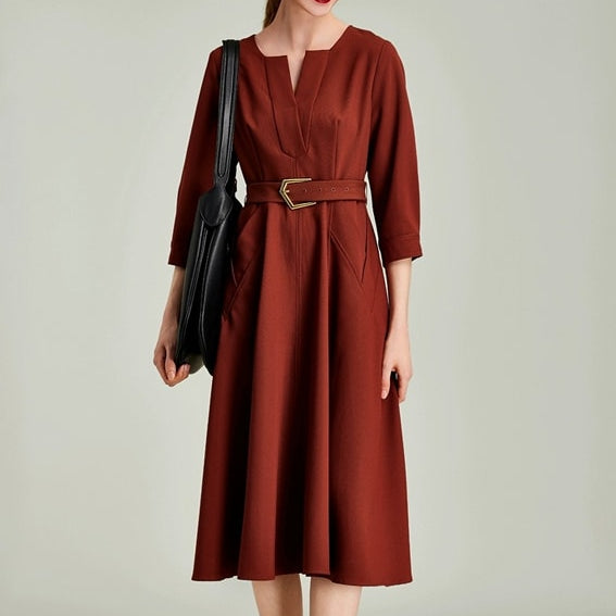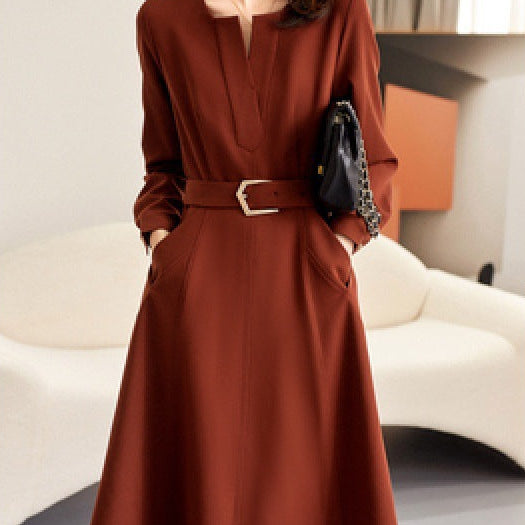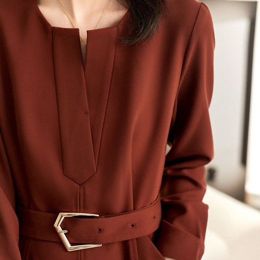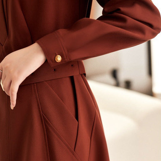 Rochie confectionata dintr-un material placut la atingere. Decolteul este in V, tip sacou in partea de sus, accesorizata cu o curea in talie, cu maneci lungi cu manseta lata accesorizata cu capse si buzunare. Rochia nu este captusita.