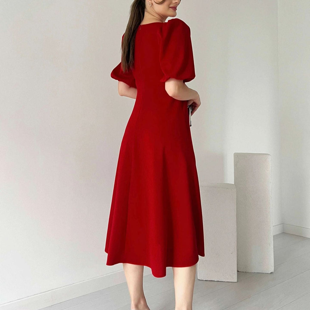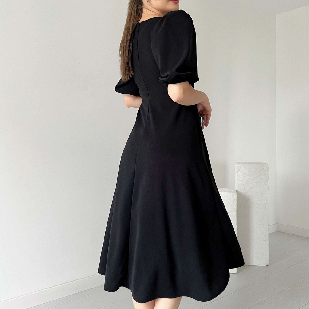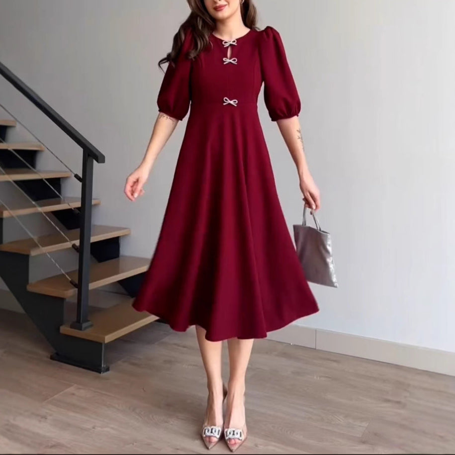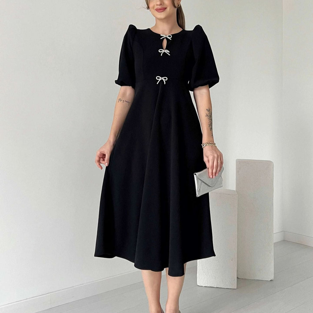 Rochie eleganta confectionata dintr-un material placut la atingere. Are maneca scurta , bufanta cu mansete din elastic. In zona decolteului este accesorizata cu fundite argintii.