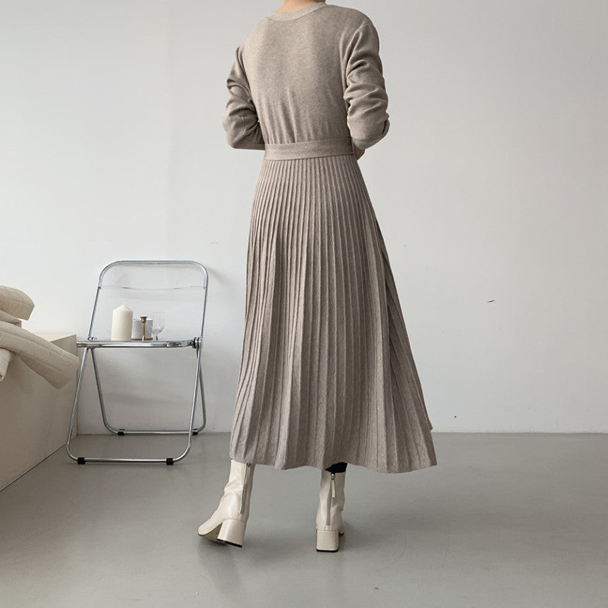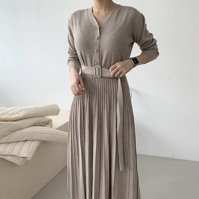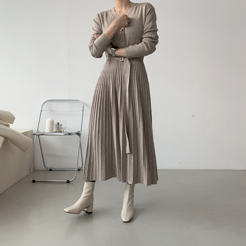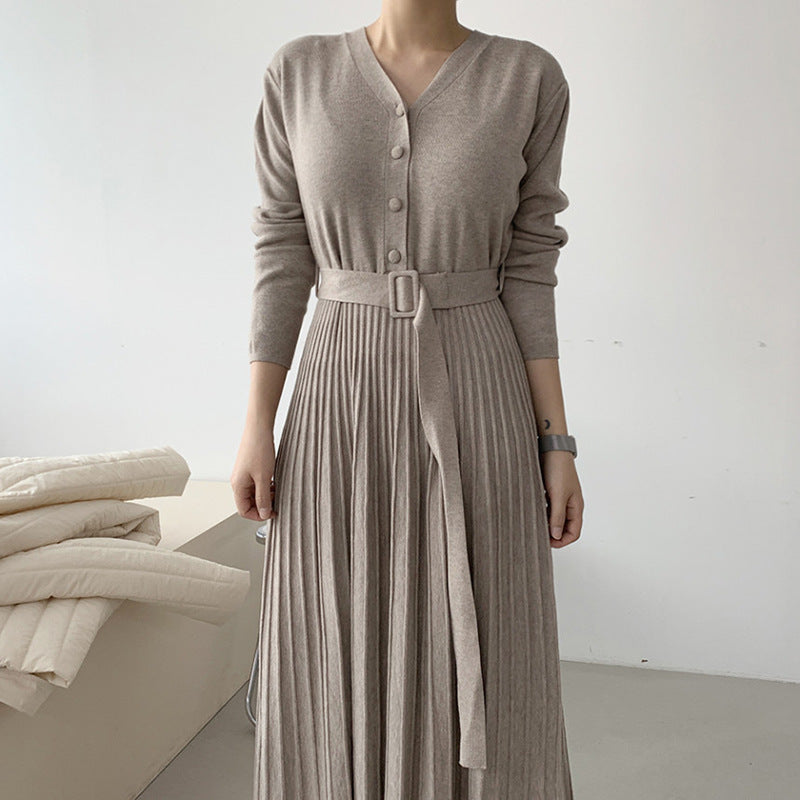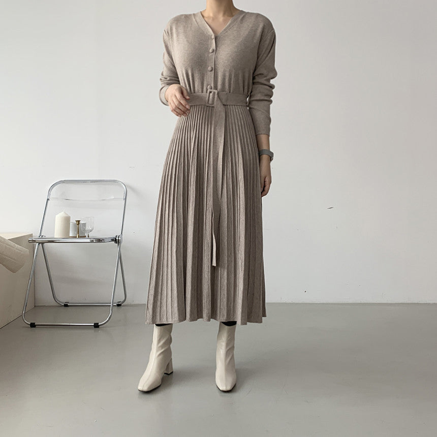 Rochie casual din tricot, cu decolteul in V, are maneci lungi, nasturi imbracati in fata si curea accesorizata in talie.