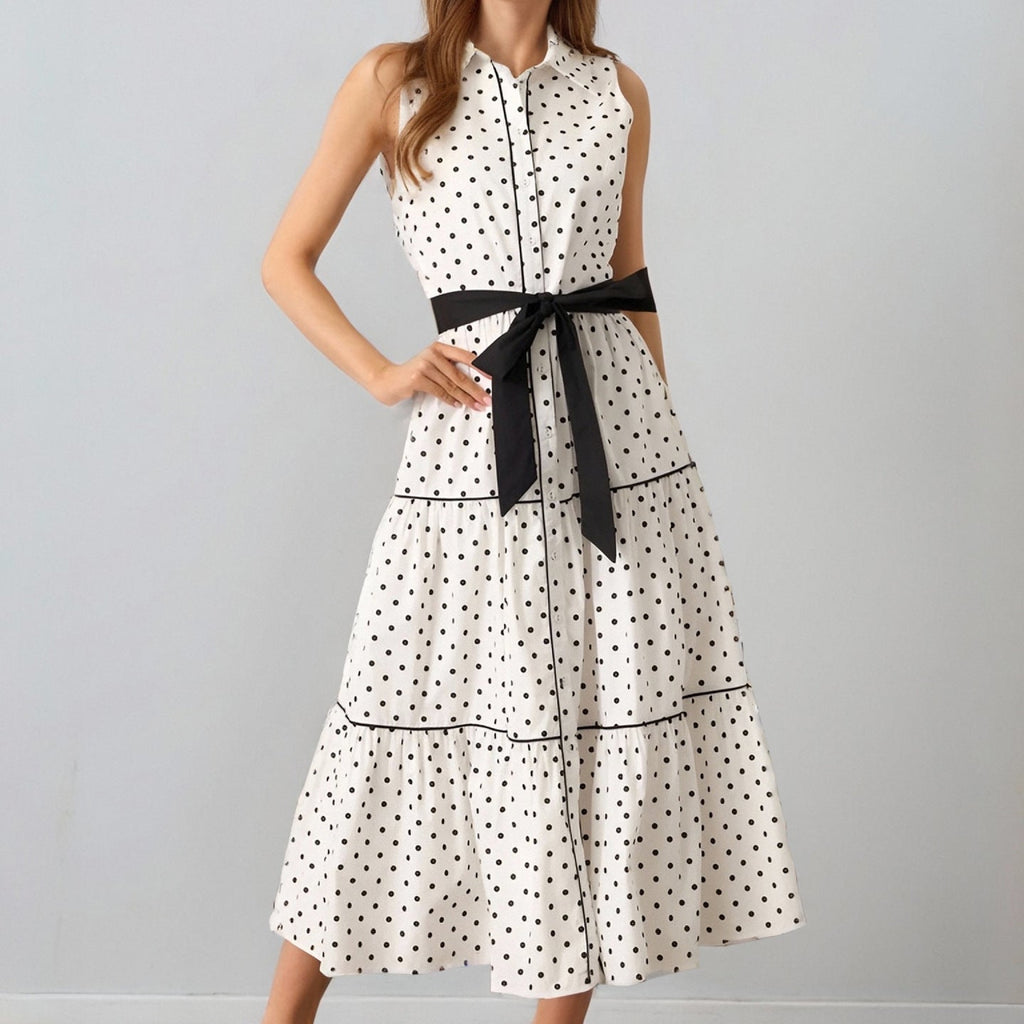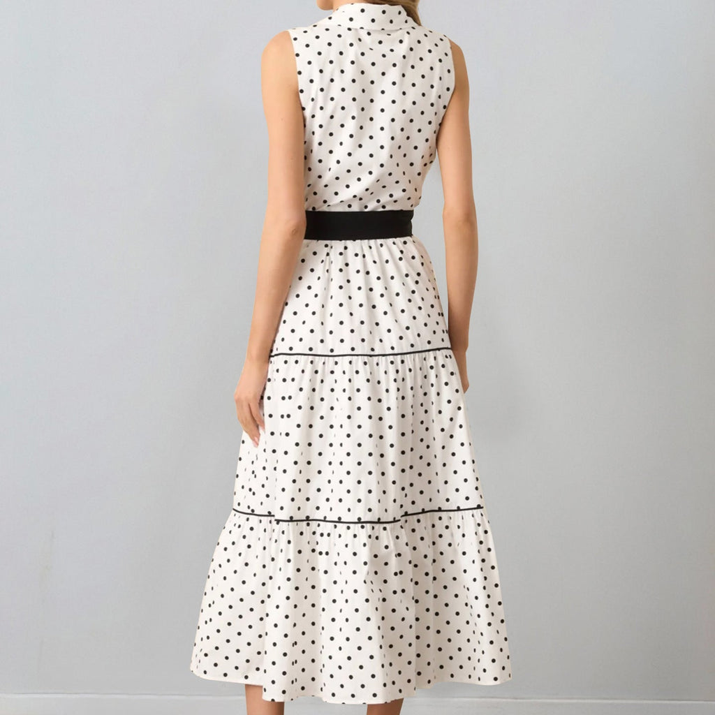 Rochie midi din material placut la atingere, cu imprimeu buline si guler tip camasa. Inchiderea se face prin nasturi iar talia este accentuata printr-un cordon. Croiul este in A.