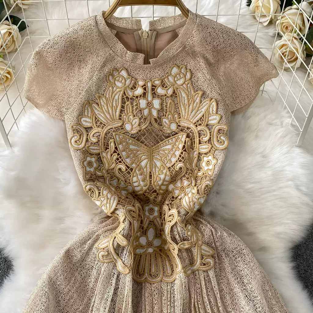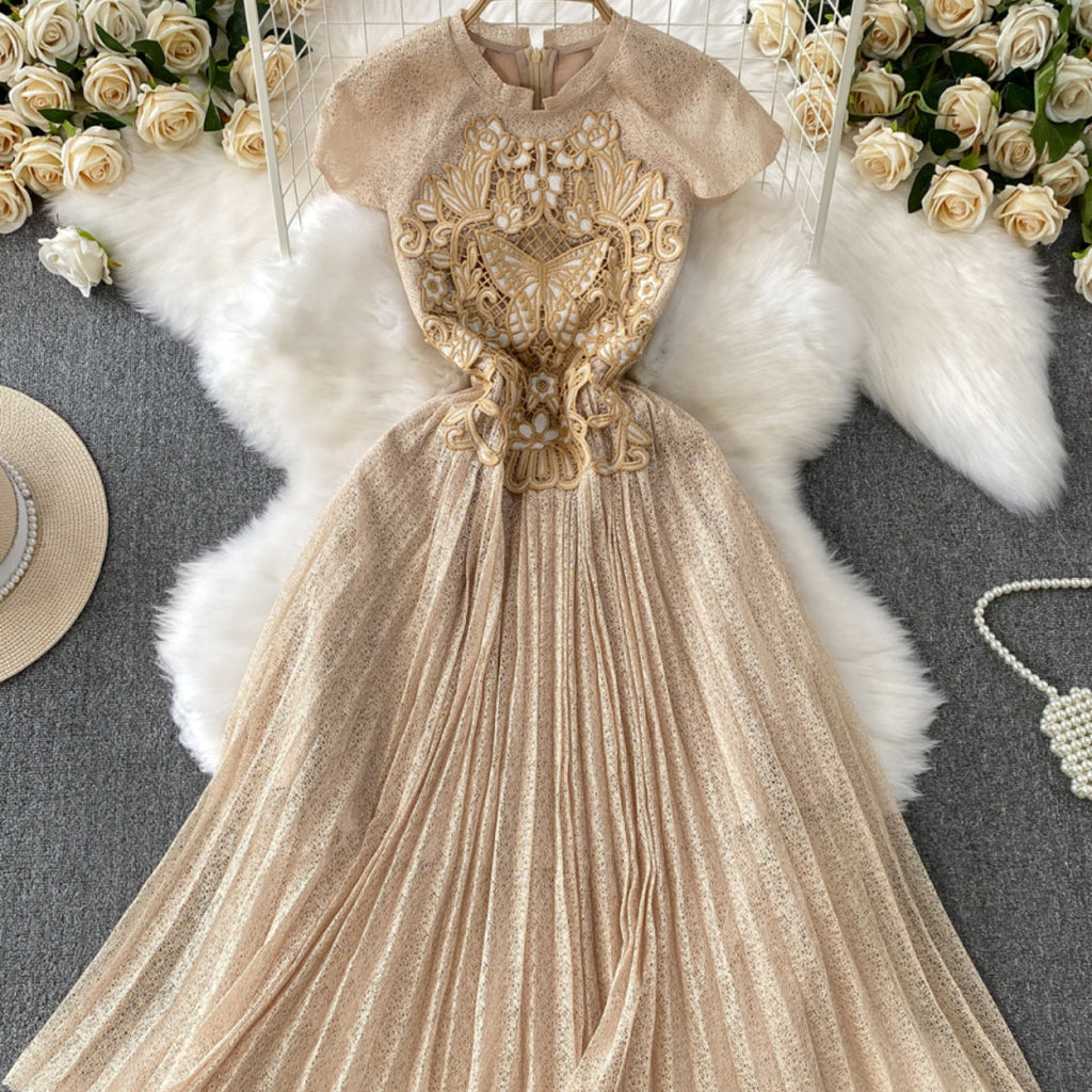 Rochie midi plisata confectionata dintr-un material placut la atingere. Are maneci scurte, pliuri si detalii florale din dantela brodata.
